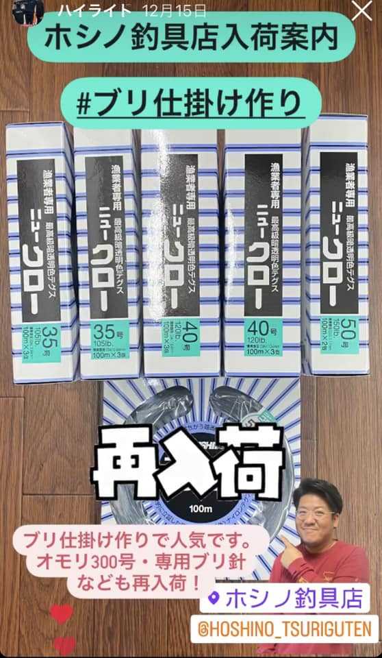 10%OFF! となります。 ※ホシノ釣具店 歳末決算セールは実店舗のみとなります 消耗品・エサ・ロッド・リール・クーラーボックス・高級ラインなどなど安く買えます。 よろしくお願いします。 =================== 【ホシノ釣具店入荷情報】 お待ちしております。 【ホシノ釣具店自動販売機24時間営業中】