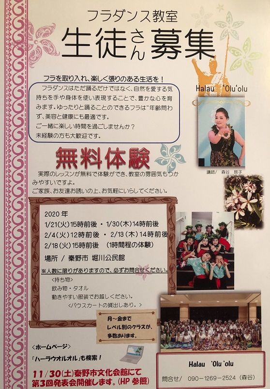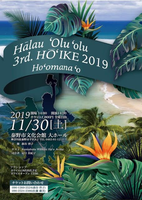 7/7(日) ALOHA STAGE 2019 in YOKOHAMA総勢60名で楽しんで出演させて頂きました。来たる11月30日(土) Halau ‘Olu ‘olu 3rd. Ho’ike -Ho’omana’o-に向けての大切な舞台と位置付けていましたが生徒の皆さんの意欲が想像以上に感じられ、とても頼もしく思える一日でした。これからも緊張感を持ちながらも自然体で‘Olu’oluのモットーである1曲1曲を大切に踊ることを心掛けて行きましょうね!Ho'ike当日会場満員のお客様に見守られご覧頂けますことを願いながら-----尚、Ho’ike詳細はもうしばらくお待ちくださいませ!現在懸命に準備しています。皆様、引き続きよろしくお願いします。■舞台待ち (ALOHA STAGE)■リハーサル風景 (ALOHA STAGE)*お知らせ* Halau ‘Olu’olu 後半イベントスケジュール (2019. 7.13.現在)1. 8/3(土) 秦野市栄町大道祭り (17:00~18:00 前後出演時間未定)2, 8/17(土) 秦野市千村白山神社祭り (15:00 以降出演時間未定)3. 8/17(土) 秦野市文化会館ホワイエ ピースキャンドル(出演時間 18:50~19:10)4. 9/7(土) 秦野市本町公民館内講習会(9:00~ 15:30.)5. 9/20(金) 秦野市堀川自治会館 (11:00 ~ 時間未定)6. 10/20(日) 秦野市北公民館多目的ホール (13:00 ~ 以降出演時間未定)7. 11/3(日、祝) 秦野市文化会館大ホール『市民の日』(出演時間未定)8. 11/30(土) 秦野市文化会館大ホール Halau ‘Olu’olu 3rd. Ho’ike 開場---14:00~, 開演—!4:30~ , フラショップオープン—13:00~ *詳細は追って掲載させて頂きます。Ke’alapualehua’olie Keiko