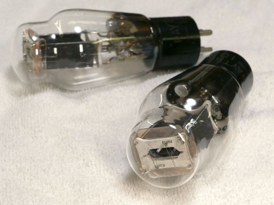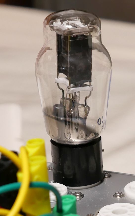 私は3X75Bみたいな、何か強そうな名前とか好きですが(笑) ebayでRAYTHEONの10を購入しました。 4ピラーです。 プレートの形状も薄べったくないボックス形状。 10族の中でも少し変わり種かもしれません。 そして... この子は10といいつつ、トリタンではなく酸化膜フィラメントなのです。 ぱっと見た感じは210とVT25Aの中間に位置する感じかなという印象なのですが... 電気的な事柄は、きっとetracerが解き明かしてくれるでしょう。 では今回もVT25Aや4043C同様に、7.5V、7.0V、6.3Vで見ていきましょう。 酸化膜なので、6.3Vでも十分なエミッションかも?と期待しています。 400Vで30mAを目安に測定します。 (すみません、規格ギリギリでした。25mAくらいを基準で測定すべきですね..。) まずは7.5Vを掛けます。(この電圧が10や801Aなどの正規のフィラメント電圧です) 【1本目】 Ef=7.5V、If=1.23A Ep=400VでEg=-28.1Vのとき、 Ip=29.93mA rp=3257Ω gm=2517μS μ=8.2V/V はぐわっ!!...高圧側がガタガタです。 泣きそうです。 気を取り直してEfを7.0Vまで下げてみましょう。(この電圧はVT25系の正規電圧だそうです) Ef=7.0V、If=1.17A Ep=400VでEg=-27.9Vのとき、 Ip=30.08mA rp=3294Ω gm=2497μS μ=8.2V/V 規格外の6.3Vで測ってみます。(この電圧はVT25系が航空機の駐機中で使用する電圧だそうです) Ef=6.3V、If=1.07A Ep=400VでEg=-27.5Vのとき、 Ip=29.93mA rp=3382Ω gm=2420μS μ=8.2V/V この高圧側のガタガタは何でしょうか...ゲッターを暖めたら治るかな?(一寸無理か) 【2本目】 こちらも7.5Vから測定します。(この電圧が10や801Aなどの正規のフィラメント電圧です) Ef=7.5V、If=1.21A Ep=400VでEg=-32.5Vのとき、 Ip=30.14mA rp=3255Ω gm=2221μS μ=7.2V/V こちらは高圧側のIpカーブが腰浮きしてますが、ガタガタではありません。 大丈夫でした。 1本目と同じく7.0Vで測定してみます。(この電圧はVT25系の正規電圧だそうです) Ef=7.0V、If=1.14A Ep=400VでEg=-32.1Vのとき、 Ip=30.00mA rp=3292Ω gm=2229μS μ=7.3V/V 2本目の6.3Vはどうでしょうか?(この電圧はVT25系が航空機の駐機中で使用する電圧だそうです) Ef=6.3V 、If=1.07A Ep=400VでEg=-31.0Vのとき、 Ip=30.13mA rp=3491Ω gm=2154μS μ=7.5V/V さすが酸化膜フィラメント、この電圧でもエミッションは十分です。 ただし、アンプを作るときは7V位はかけてあげたいところです。 今回の測定結果ですが、 1本目と2本目のバラツキはとても大きく、1本目の高圧側のIpカーブはガタガタです。 しかし、これは売り手が悪いとはいえません。たとえば300V位でちょっと電流を測れば正常値なのです。 カーブトレーサーで見るか真空管試験器で余程の長時間電流値を見るかしないと見えない現象化と思われます。 良くも悪くも珍しい古典管です。「腐っても鯛」ですし「アバタもエクボ」です。(^_^; rpに関してはトリタンの210より若干低く、SYLVANIAのVT25Aより高い、rpだけで比較するならSTCの4043Cに近いですね。 ソフトンのVT25A用アンプに挿してみました。 プレート損失を若干オーバーするので、数曲でやめておきました。 十分な真空度もありますし聴感上の歪みは感じないので、特性のガタガタは大きく悪影響しないのかもしれません。(というか、めっちゃ音がいいです。真空管って楽しいよね。) 管内壁に蛍光も現れているので、酷く真空度が落ちているわけでもなさそうで、きちんと電子は飛んでいます。 あのガタガタは気にしないことにします。 真空管沼にズブズブと入りそう... お気に入りの記事を「いいね!」で応援しよう