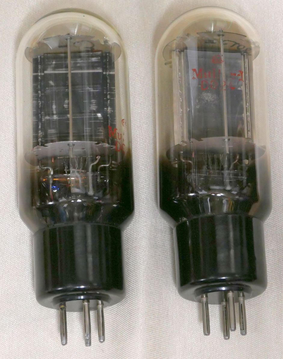 意地でもPX25は買わないです。(笑) 以前DO25という真空管(片方はエミ減)を紹介しました。 DO25とDO24では番号が1番違いですがrpなど諸々の性格は異なります。 今回のDO24はフィラメント電圧が4Vなので使いやすいと思います。 フィラメントは4点吊り。 点灯しても写真に写らないほど暗いです。 逆に言うと、それくらいの温度で十分に電子が放射できるということです。 DO24の規格はThe Valve Museum「DO25」規格が参考になります。 DO24の情報ですが、結構あります。持って居られる方が多いです。 EU Valve「PX25の各種同等管」 ひま人の館「欧州の真空管(PX25とDA30属)」 球球コレクション「DO24の悲劇」 こころの畔「MULLARD DO24 規格」 が参考になると思います。 最終型(私のやつ)はフィラメント電流が少なめに設定され、高効率型になっているようですね。 etracerで特性を測定しましょう。 320V48mAくらいになるよう測ります。 Efは4.0Vと3.8Vの2点です。 【1本目】黒色プレート Ef=4.0V, If=1.75A Ep=350V Eg=-27.9V Ip=47.93mA rp=1315Ω gm=6696μS μ=8.8V/V Ef=3.8V, If=1.66A Ep=350V Eg=-27.7V Ip=48.33mA rp=1336Ω gm=6688μS μ=8.9V/V 【2本目】灰色プレート Ef=4.0V, If=1.77A Ep=350V Eg=-31.7V Ip=48.08mA rp=1206Ω gm=6685μS μ=8.1V/V Ef=3.8V, If=1.70A Ep=350V Eg=-27.7V Ip=47.93mA rp=1222Ω gm=6683μS μ=8.2V/V 2本目(灰色プレート)は高圧側が不安定なので500Vまでの測定としました。 このあたりからおかしいということはEp320Vくらいで動作させ最大出力2Wそこそこで済ませるのが無難かもしれません。 アイドリング時の特性(一般的な元気度)だけ見れば問題ない真空管も、スイングしたとき(アンプ動作時)の具合の良し悪しはカーブトレーサーでないとわかりません。 古典管は常にこういう問題がつきまといますが、「そういうもの」と割り切る覚悟が必要かもしれません。 この球はフィラメント電流から、間違いなく後期型ということがわかります。 エミッションはEfを0.2V下げてもgmが殆ど落ちませんので大変良好です。 ただ、2本のバラつきはあるようで、特に2本目(灰色プレート)は高電圧低電流域でガタつき(放電の予兆のような不穏な動き)という問題がありましたので、320V50mAを中心として5kΩ~7kΩの負荷で振って最大2Wというのが無難そうです。 2Wという出力は高能率スピーカー相手なら十分すぎる数値です。 お気に入りの記事を「いいね!」で応援しよう
