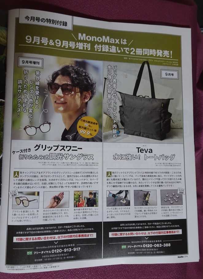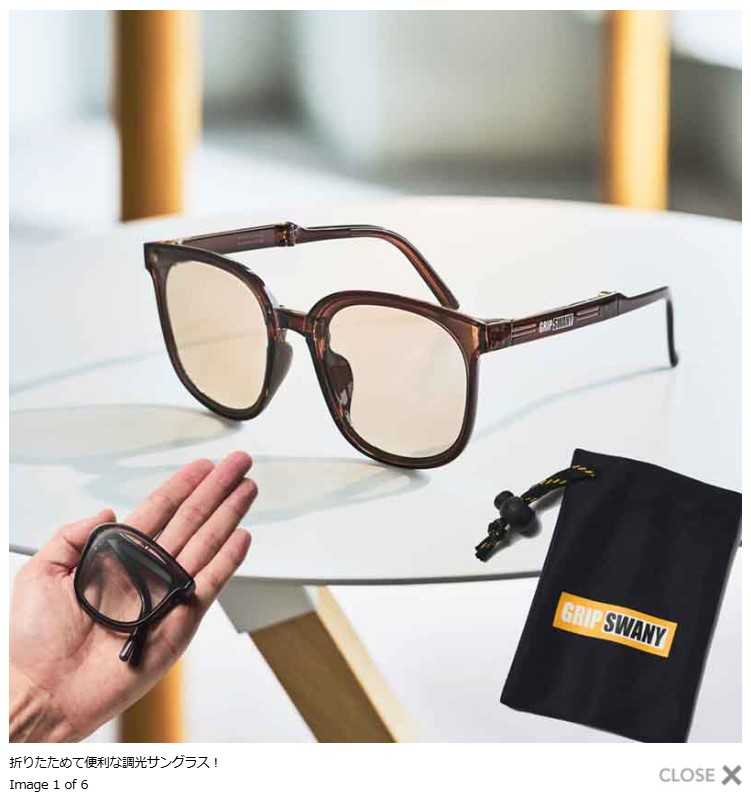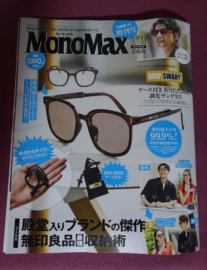雑誌は『MonoMax』9月号で、【特別付録】は、米国の老舗キャンプウェアブランド「GRIP SWANY(グリップスワニー)」と初コラボした調光サングラスです。