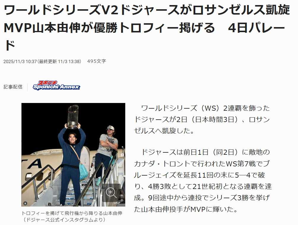 ドジャースは前日1日(同2日)に敵地のカナダ・トロントで行われたWS第7戦でブルージェイズを延長11回の末に5―4で破り、4勝3敗として21世紀初となる連覇を達成。9回途中から連投でシリーズ3勝を挙げた山本由伸投手がMVPに輝いた。