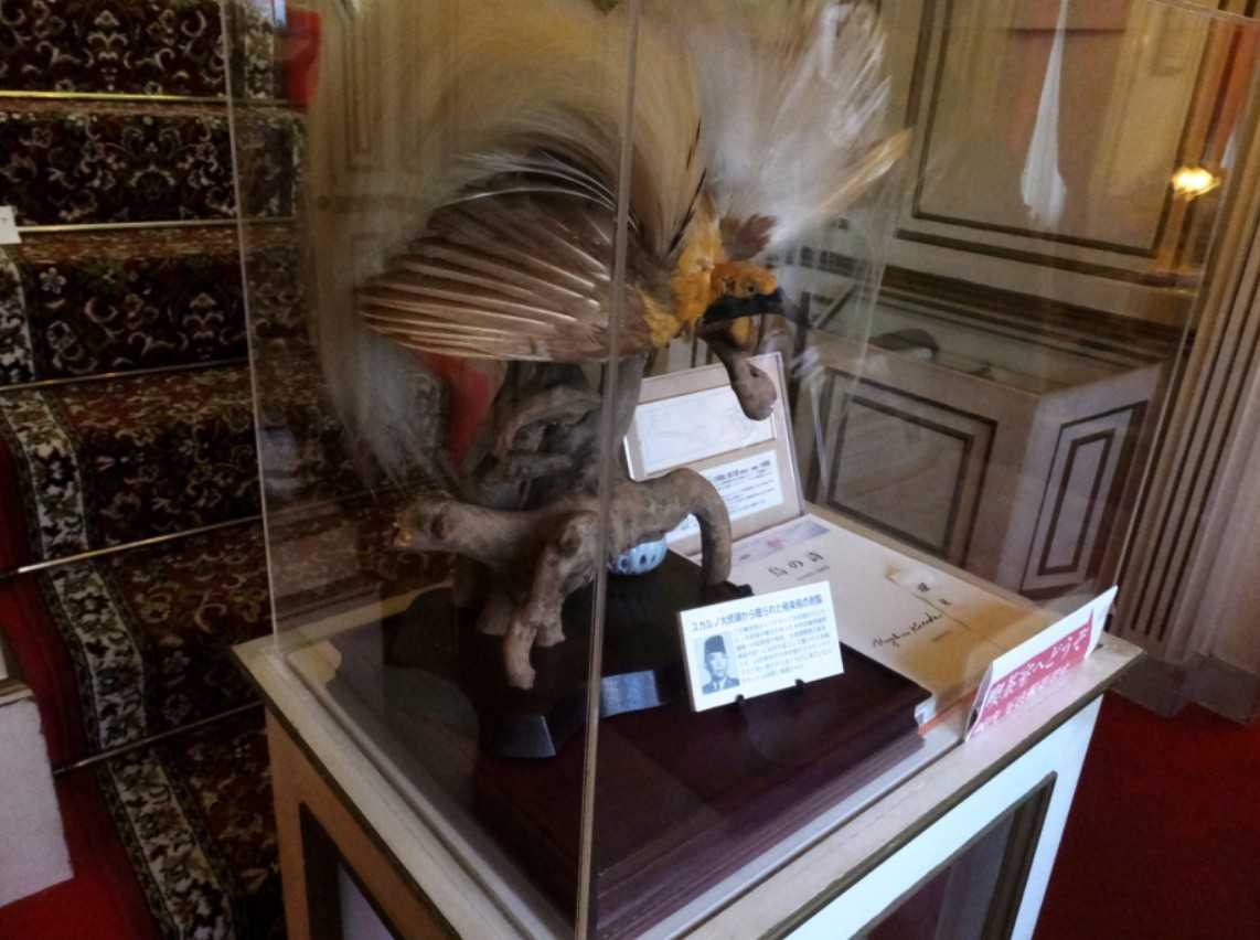 階段の手前には、インドネシア・スカルノ大統領から木村武雄元大臣が贈られた剥製を、このお城の玄関に描かれた鳥と同じ鳥だからという理由で次に贈られた極楽長の剥製が飾られています。