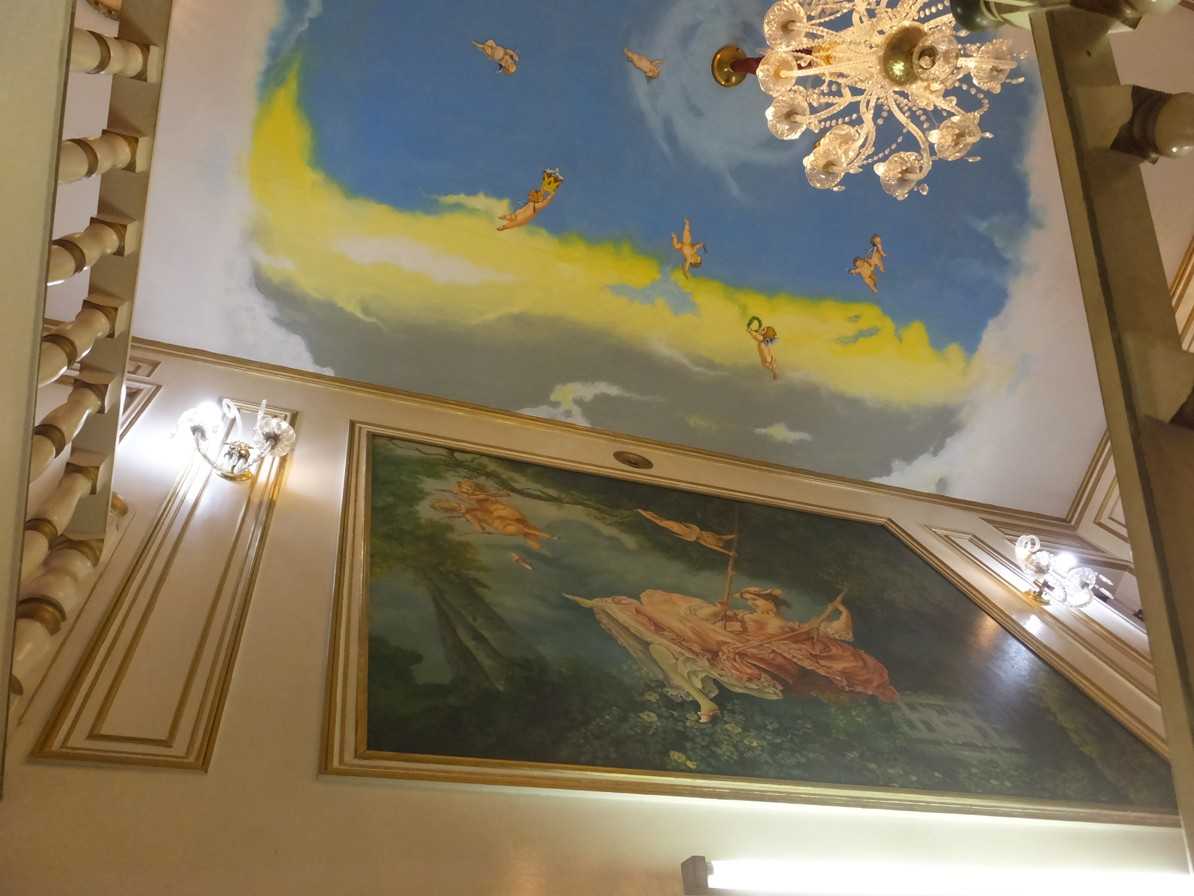 階段室を見上げると、天井画が描かれ、16灯のシャンデリア、正面の壁には肖像画、対面の壁には200号のキャンバスに描かれた宮廷画家フラゴナールの「ブランコ」が模写され天井画と一体になっています。