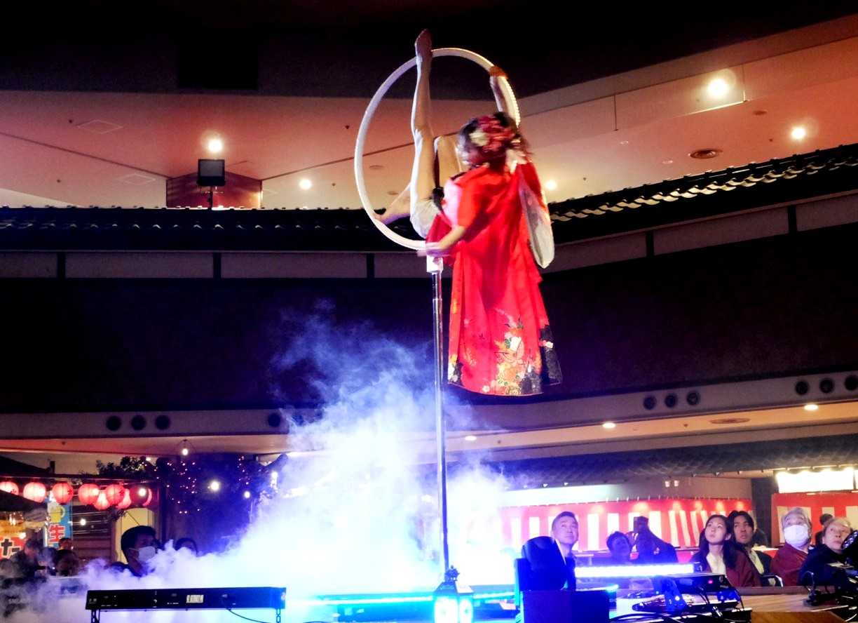 前日同様、ジャグリング等のマジックショー、和太鼓演奏「魅音(みとん)さん」、女剣劇「刀衆」、ジャズ演奏が続き、そして大道芸アートとしてポールダンスを世界で初めて始めたヘブンアーティスト「めりこ さん」、ポールダンスを目の当たりにするのは初めてです。
