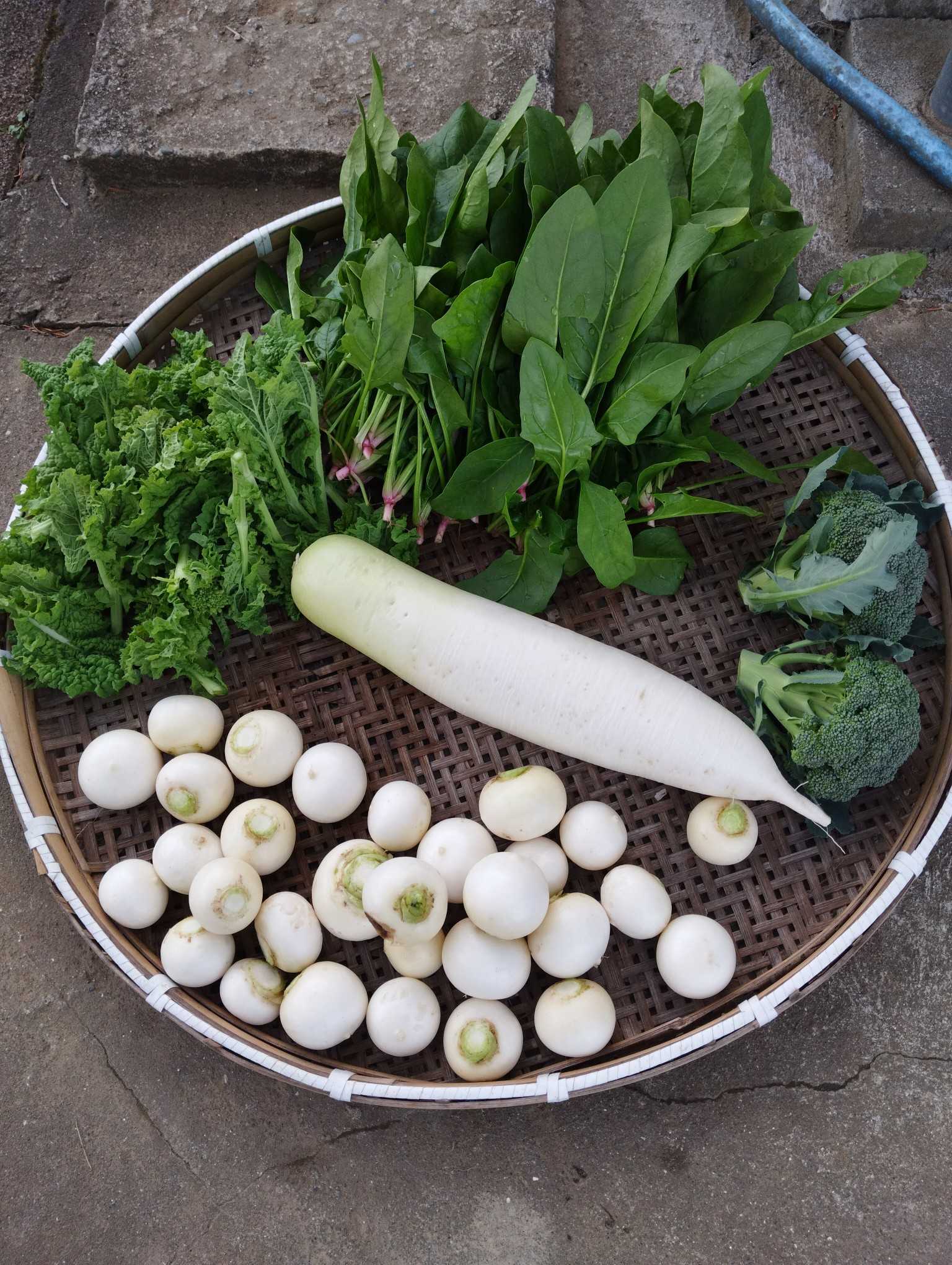 今日もたくさん野菜を収穫しました。カブは、終わりに近づいてきました。ダイコンは、太…