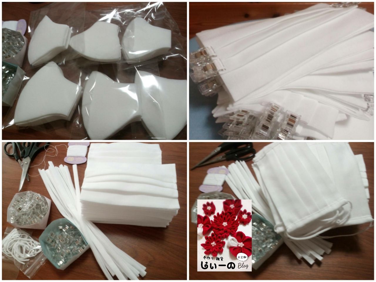 ミシン、普段滅多に使わないので、いつもは使う時だけ実家に行ってました。こんな状況になるまでは、私と同じく「わざわざ購入しなくても、実家にあるし…」と考えていた人も多かったと思います。新型コロナの影響で出来るだけ外出しないように心がけていて、実家にも帰れないので…今回、思い切ってミシンを購入しようと4月から色々探しました。しかし、悩んでいる間にも入荷予定が延びていき、決心がついた頃には納期はかなり先に…仕方がないので、両面テープを使ったり手縫いでマスク作り。YouTubeで色々な動画を見た中から、リードマスクとさらしマスクを作ってみました。リードマスクは、0,5mmの両面テープを使いました。マスクゴムも使い捨てにするのは勿体ないので、仮止めクリップの穴にマスクゴムを通して繰り返し使えるようにしてみました。※画像撮り忘れました…立体マスク、想像以上に大量の端切れが出るので、捨てずにビニール袋にまとめておきました。後日、揚げ物をした時にリードの端切れが詰まったビニール袋の中に油を流し入れて捨てるのに役立てました。※油は充分冷やしてからそして、さらしマスクは全部手縫いで作ってみました。こちらもYouTube動画を参考にしました。さらしマスクを手縫いする前に手拭いマスクを試作していたので、21cm(本体部分)と4cm(両サイド/バイアステープ)幅でカットして作っています。自分達で色々試した結果、縫い付ける場合は大人用ならマスクゴムの長さは片耳20cmぐらいがちょうど良いのかなと思います。※作る前に水通しはしていません。和裁をした事が無いので想像ですが、反物を縫う感覚に近いのかなと勝手に思ってます。手拭いの感覚で、洗ってみても正直ほとんど縮まない気がします。手縫いで製作過程に触りまくるので、先に水通ししてから作っても二度手間かと洗濯後に縮む想定で最初から大きめに作ってみましたが…。出来上がったさらしマスクは一気にハイター浸けで除菌をして、洗濯洗剤で手洗い後に洗濯ネットに入れて脱水し陰干ししてアイロン掛けをしてみました。最近は色柄物のマスクも沢山出てきているので、色柄物にはハイターは使わずに洗濯洗剤でのお手入れにしてくださいね。さらしマスクは白なのでハイター浸けおきで除菌と漂白をしているだけですので…立体マスクも作ってみたい気持ちがありますが、プリーツマスクだと布を無駄なく使えるので、結局プリーツマスクしか作りませんでした。出来上がったマスクは両家両親や兄弟、そして親族にも少しですが送付しました。手縫いなので、一気に大量には作れないのが難点ですが…まだ身内にも自分達にもアベノマスクは届いていないので、家にある使い捨てマスクが無くなったら、手作りマスクも活用しようと思っています。ミシンを持っていなくても、手縫いでなんとか作ってみたというだけの内容ですが、同じくミシンの納期待ちで、縫い針と糸は持っているという方の参考になれば幸いです。ミシンは1度買えば壊れない限り何十年も使えるものなので、安いミシンではなく、文字も刺繍出来る本格的なタイプを注文してみました。それでも納期予定は1ヶ月以上待ちですが、届いたら大切に使いたいと思います。