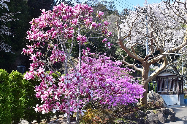 4月12日 仙台は天気予報ハズレ良い天気に16.2℃ 昼過ぎからみるみるお天気に 雲もなくいいお花見が出来ました 旧塩釜街道 岩切の今宿 まずは東光寺さんへ立ち寄りました 遠くから見事な桜が目に入り 立ち寄りました 本堂前の 大きな桜が丁度見頃でした 庭には 柴モクレンとツツジが満開に 陽当りが良いのですね 今日の目的は青麻道を行く事 青麻は昔の着物の原料の植物 平安時代の着物の原料 そして ここには青麻神社への道かあります まずは岩切城址へ 震災で道が崩れたので だいぶ暫くぶりです ここは南北朝時代、戦国時代より留守氏のお城だった 後の伊達政宗の家臣に