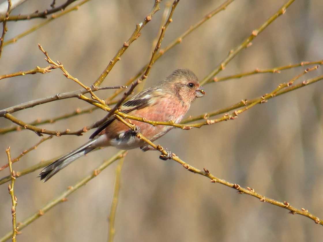 立春を過ぎ暦上では春となった吉川美南駅近郊の西口の中央公園前の調整池、東口の第一調整池の鳥たちを探索しました。 (ベニマシコか次々登場) 西口調整池沿岸の葦原では、ホオジロ科のベニマシコ、ホオジロ、カシラダカ、アオジが次々と登場。ベニマシコは、イネ科やタデ科の植物の実、特にセイタカアワダチソウ、ヨモギなどの実や芽を好んで食べることが知られており、お目当ての餌を求めて沿岸の葦原に飛来しているものと思われます。 今朝姿を見せたのは、写真一枚目の頭上に褐色味があり体下面が紅色の雄と思われる個体、写真二枚目、三枚目の上面がの紅色が淡く、背、腹にかけて黒い縦斑がある雌個体でした。体に割に嘴が小さめで丸い感じがしました。草の実や芽をついばむのに最適化したものではと思います。 (その他ホオジロ科の鳥たち) ・ベニマシコを観察した直後、ホオジロが葦原に登場しました。頭部に黒色部がなく、頭部と耳羽が褐色で雌個体でした。ところが腰が紅色です。赤褐色の個体が多いのですが、こんなに紅色の見えたのは初めての経験でした。 ・カシラダカは、頭上、耳羽が褐色で、胸に茶色の帯がある雌個体でした。 ・アオジは、一見すると雌のように見えましたが、頭上、耳羽が緑褐色で雄冬羽でした。 (東口第一調整池とその近郊) 第一調整池に向かう途中の草地でタゲリ2羽の姿を見つけました。少し動いては地中の中のミミズの動きを耳で聞いているような素振りを見せていたと思ったら、ミミズを掘り出しちゅるりと飲み込む姿を目撃できました。 観察できたのは、長い冠羽と上面に緑光沢がある成鳥冬羽個体と羽縁にバフ色がある第一回冬羽と思われる個体でした。 その後は、散歩道のフェンスに降り立ったジョウビタキ雌、岸辺で羽づくろいをしていたハシビロガモの姿を観察しました。ハシビロガモは嘴基部に白い帯状の線がある個体を1羽観察しました。頬にミカヅキ斑のあるハシビロガモに関して一昨年11月にリポートしましたがそれとは別の特徴のある個体でした。 (写真)2026年2月5日撮影