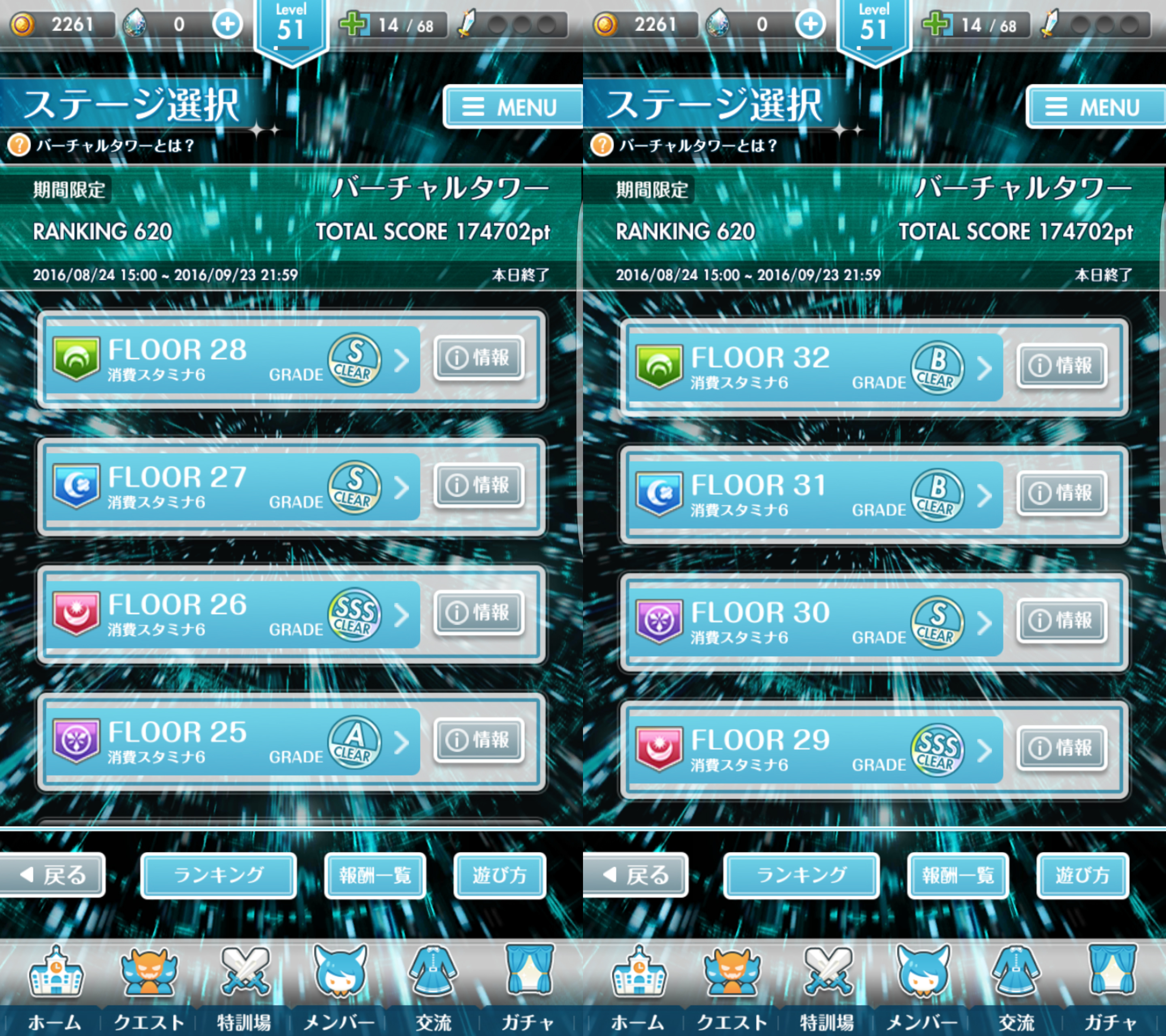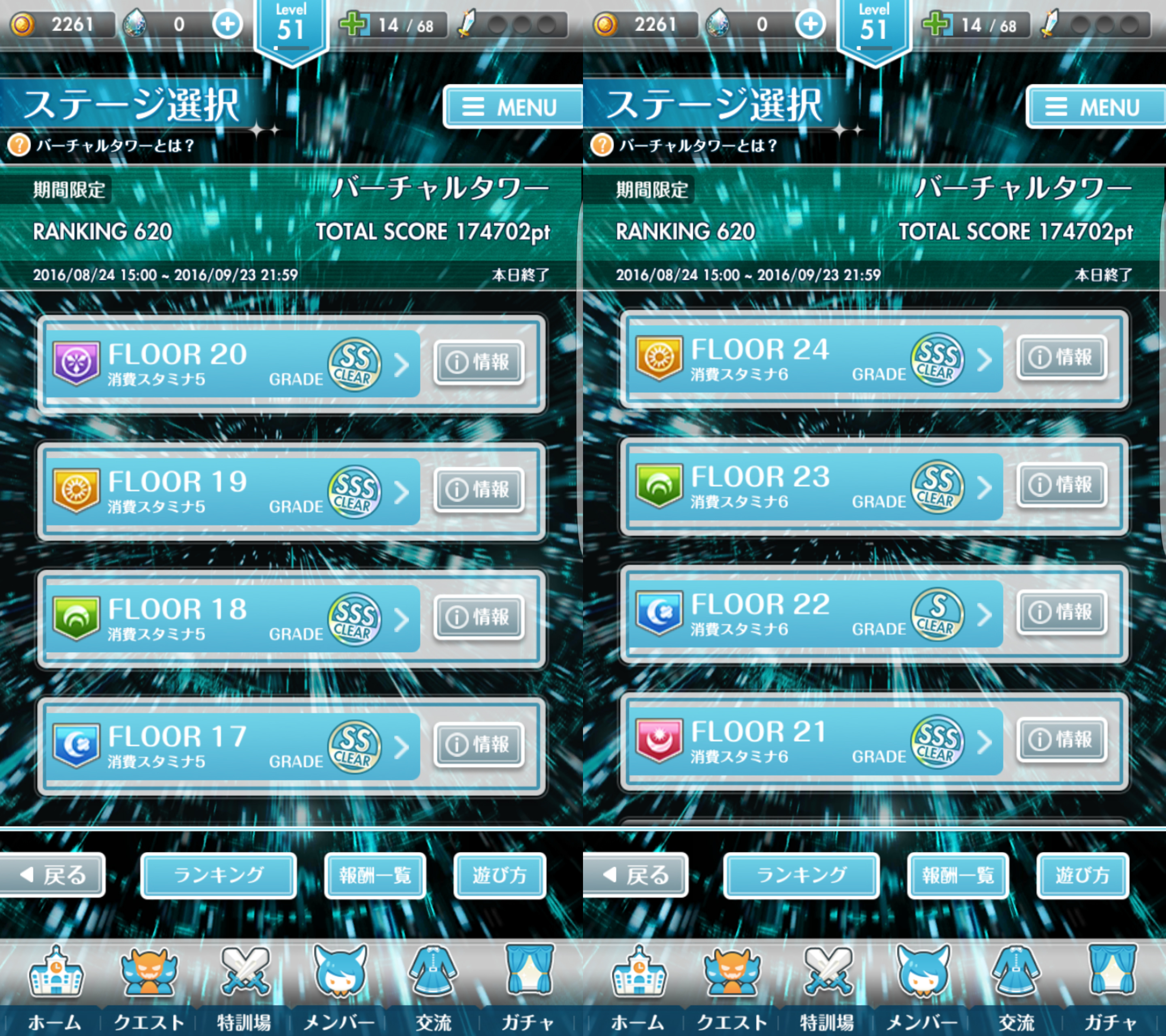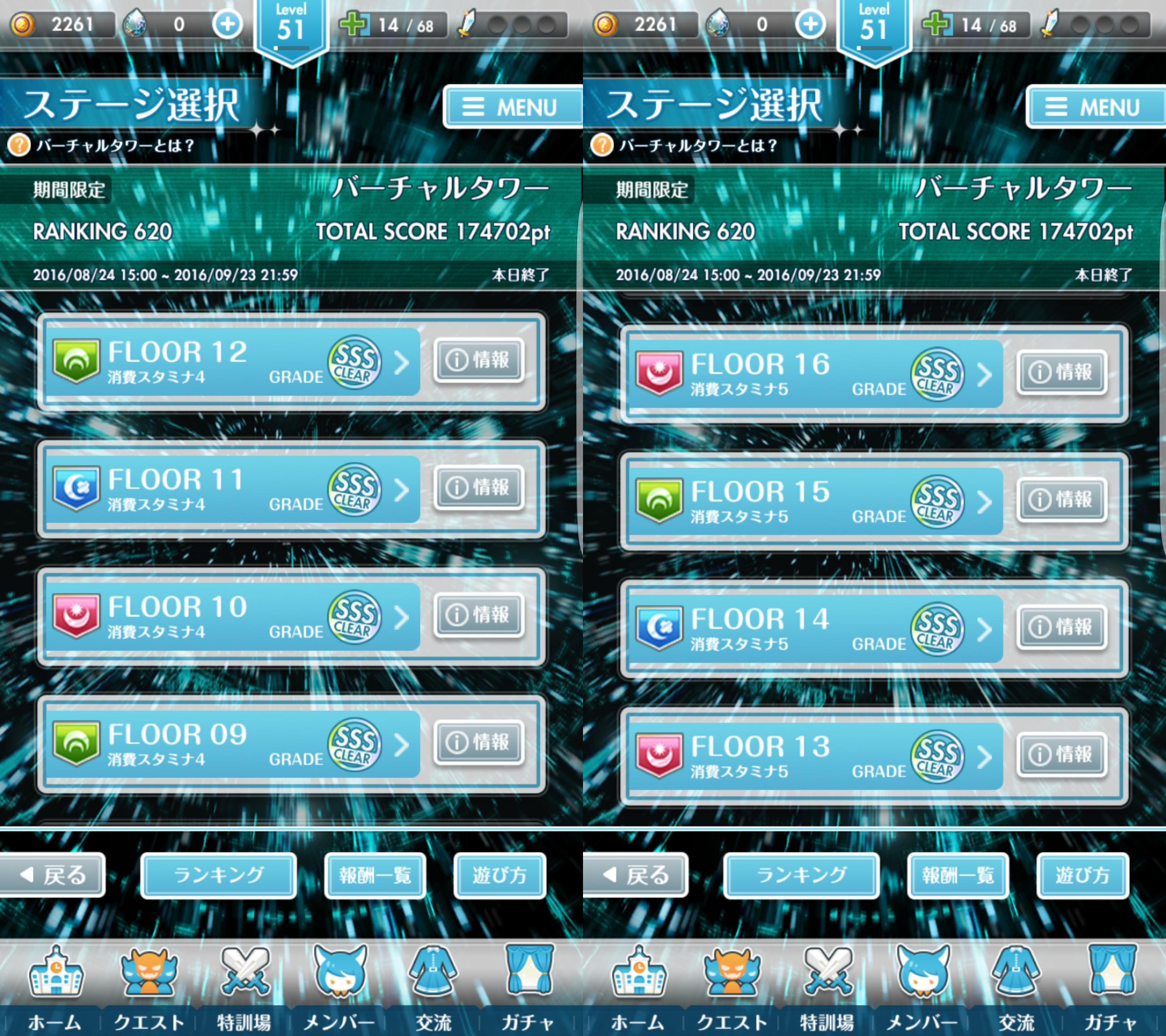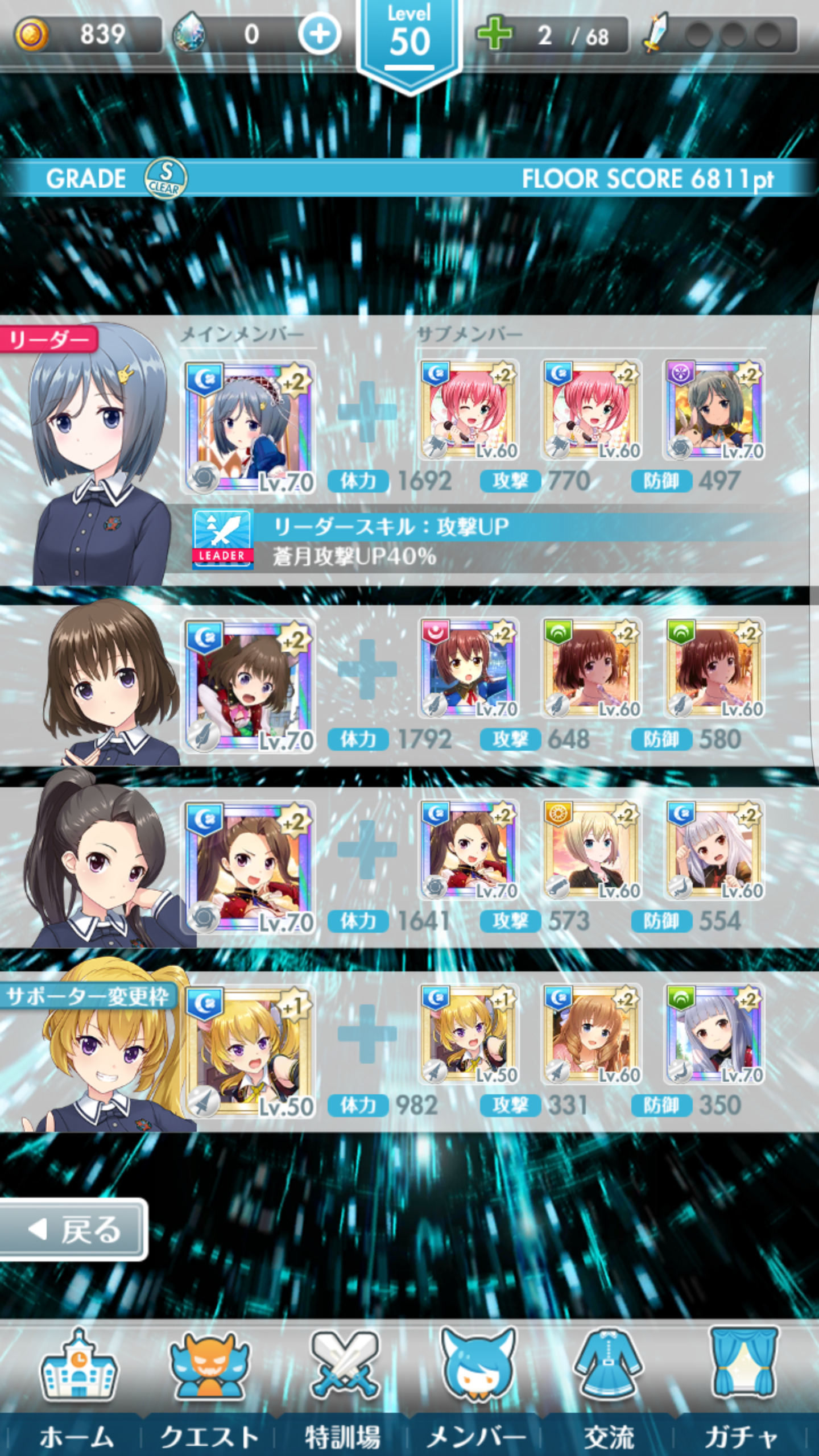 ![]() ![]() ![]() ![]() ![]() 無課金ですが全フロア制覇しました トータルスコアは17万オーバーで終了時点で620位でした ![]() 上記は37FをSランククリアした時の編成ですが、上記編成で1F~40Fの碧月以外を制覇出来ました 碧月フロアだけは紅月編成でやりました サポーター枠は同じく混乱持ちの桜子と入れ替えで使ってました 上層のCランクの場所をもうちょい詰めればBランク以上は行けたっぽいので18万ぐらいまではスコア伸ばせたかも ただもう1000位のスコア見ると楽勝だったのでラストは放置して別ゲーしてました ![]() 40Fはサポーターを桜子に変更しただけでクリア出来ました(一応敵対属性でやったほうが安定) お気に入りの記事を「いいね!」で応援しよう