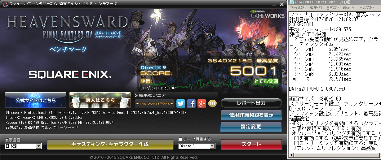 ![]() 前記事通りで購入しました 購入して1日で届きました やっぱ日本の配送ってすごいよね~ ![]() HAF Xも同時に購入してるのでHAF 932から全パーツまるごと引越ししました 上記がその時の画像です このときは1080Tiが2.5スロットなのを考慮しないでそのままRX480載せたら、x8接続になってしまったので後にRX480のスロットを一段下げx16接続にしてあります マザーがX79 EXTREME11なのでPCIスロット2段づつにVGA挿せば最大4枚のVGAをx16接続できます GeForce+RADEONのデュアルGPU環境については過去記事に載せてあります GPUに10万使うのは今回が初めて・・・ いつもゲフォ、ラデは最上位のひとつ下とか選びますからね・・・ 大体コスパ重視♪ 今回は気合い入れて1080Tiを選んだというわけ titanxpとか出てますがそれは置いといて・・・ 性能、ベンチは後で説明しますが、やはり消費電力が気になりますね~ FF14、3DMarkどちらも最大500Wオーバーが多いです もちろん、CPUが2697v2、GTX1080Ti、RX480、ファンフル回転なので消費電力多くて当たり前ですが・・・ GTX780使ってたときは4930kOC+GTX780でも400W超えた程度だったので、今回で消費電力がかなり増えました というわけで早速ベンチです 比較対象は手持ちのRX480(GTX980~980Tiの性能なのでわかりやすいかと) ※1:SteamVRパフォーマンステスト ![]() 何故かどちらもシステムのスペックがGTX1080Tiですが右がRX480のベンチ結果です 変な表示なのはおそらく?GeForce+RADEON環境を想定してないから? GTX1080Ti=19970:11(非常に高い) RX480=8724:6.9(高い) スコアはやはり1080Tiのほうが倍以上のスコアになりますね 1080=RX480CFなので108より30%早いとされる1080Tiは流石にスコア高い(スコアカンスト?) ※2:ファイナルファンタジーXIV: 蒼天のイシュガルド ベンチマーク(3840x2160 最高設定 DX9) ![]() 上記はRX480、スコア:5001 ![]() 上記はGTX1080Ti、スコア:10811 WQHD以下だと1080Tiが仕事しないので4kで比較 DX11だとRADEONが極端にスコア悪くなるのでDX9で比較 比較ベンチしたらスコアがまんま倍違いました 今回はこの辺で終わります 3DMarkはまだやってないのでそのうち載せるつもり お気に入りの記事を「いいね!」で応援しよう