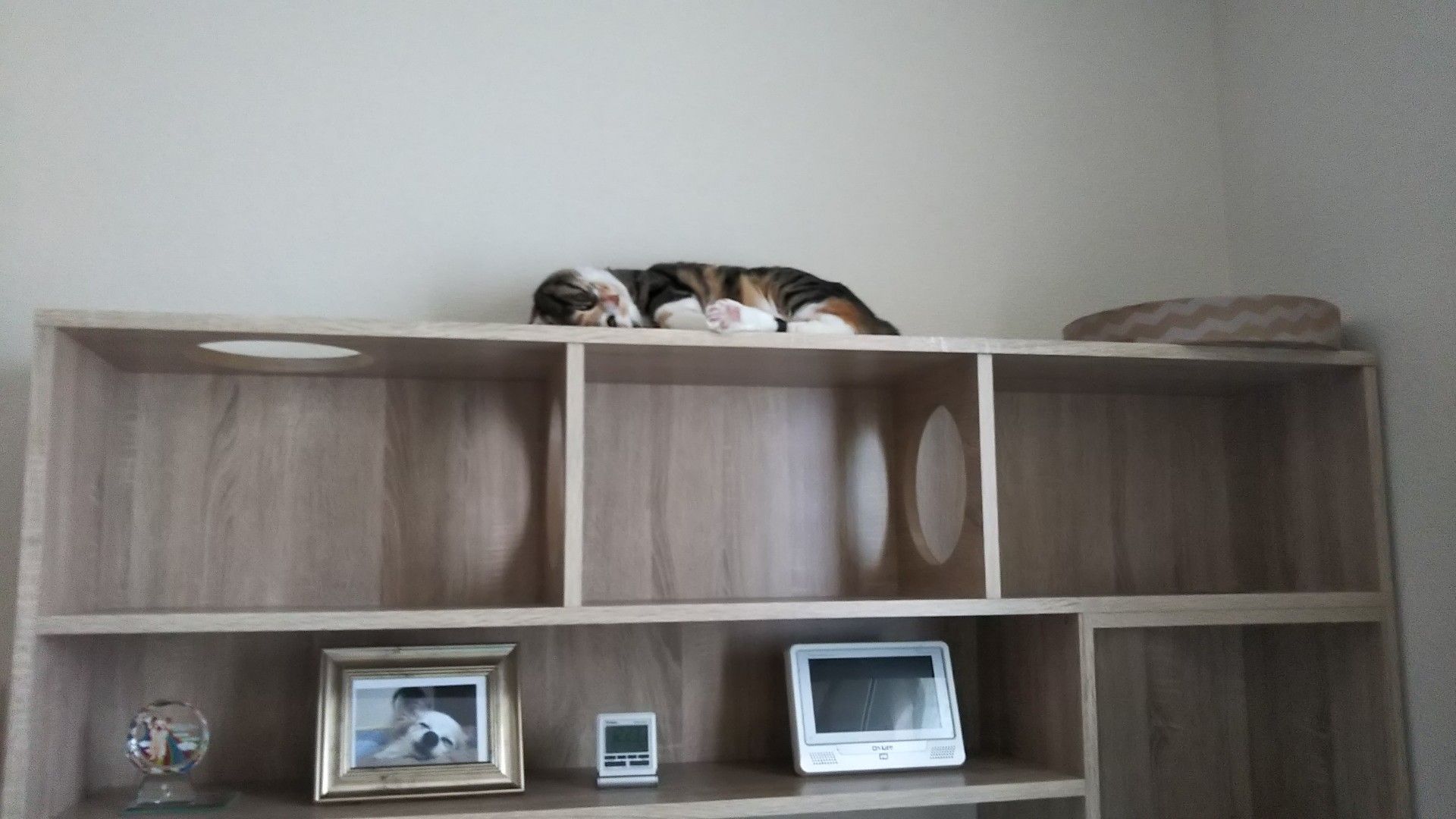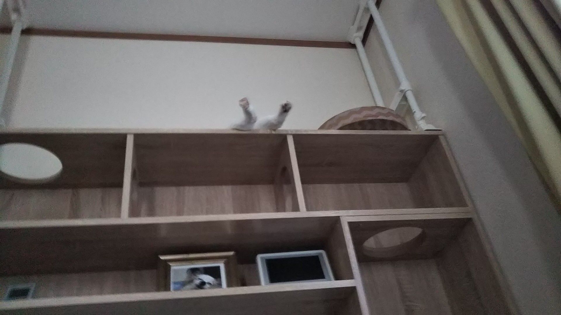 耐震用の突っ張りもしましたこの商品は幅180と150とありますが、うちのは150です作りがしっかりしていて収納力もあり、良いですアーパンは、すぐに慣れて気に入って使っています2ニャンは体重4.5キロ体格は違いますパンちゃんはザッツ和猫体型ずんぐりと丸く、手足は長くなく短すぎもしないアーは手足が長く、体格はシュッとしています問題なく使っています問題は、きーちゃんやっと使いはじめてくれたのですが…後ろ向きに後ずさったのか、穴から落ちて、穴に両脇を引っかけて、バタバタと困っていたのが一昨日の夜ここの穴です↓昇るところですね上の段にいたのは見たのですが…写真でいうと→壁がわに顔を向けて、両脇を穴に引っ掻けて、下半身はブラーンと…体重3.5キロと小柄で、手足がとても短いのですきーの足では、斜めにある足場に足が届かず…この足場ですが、高さは3種類変えられますが、一度決めると後からは変えられませんそれと、さほど高さに差が無いです一番上に設定していたとしても、どちらにしろ届かなかったでしょう身長から考えても設置位置は問題無かったのですが、多少、足場の幅があると、きーには良かったのかなぁその時は走っていって助けました(^^;猫でも、降りようと思ってないところに不意に落ちるのは怪我しますからあと欲しいなぁと思うのは、一番上の穴を、もう1つ一番上に上がる穴が1つしかないと、こういう時の行き交い、どうしますー?アー&きーは行き交いますが、トパは通しませんよー(^^;隣に自前で穴開けようかと思いますそうすれば、トパがいても、アーきーは上に上がれますから、、あと、足場の板ですが、角ばっているので、丸く削って欲しいですねその辺を改善していただけると、いいかなぁでも、とてもしっかりしていて、満足な商品です(*・∀・*)ノ壁面収納テレビ台 ハイタイプ テレビ台 150 壁面収納 32型 42インチ 42型 43インチ 43型 TV台 テレビボード キャットウォーク キャットタワー 猫 ねこ ネコ ペット 一人暮らし おしゃれ 収納 多い シンプル スリム