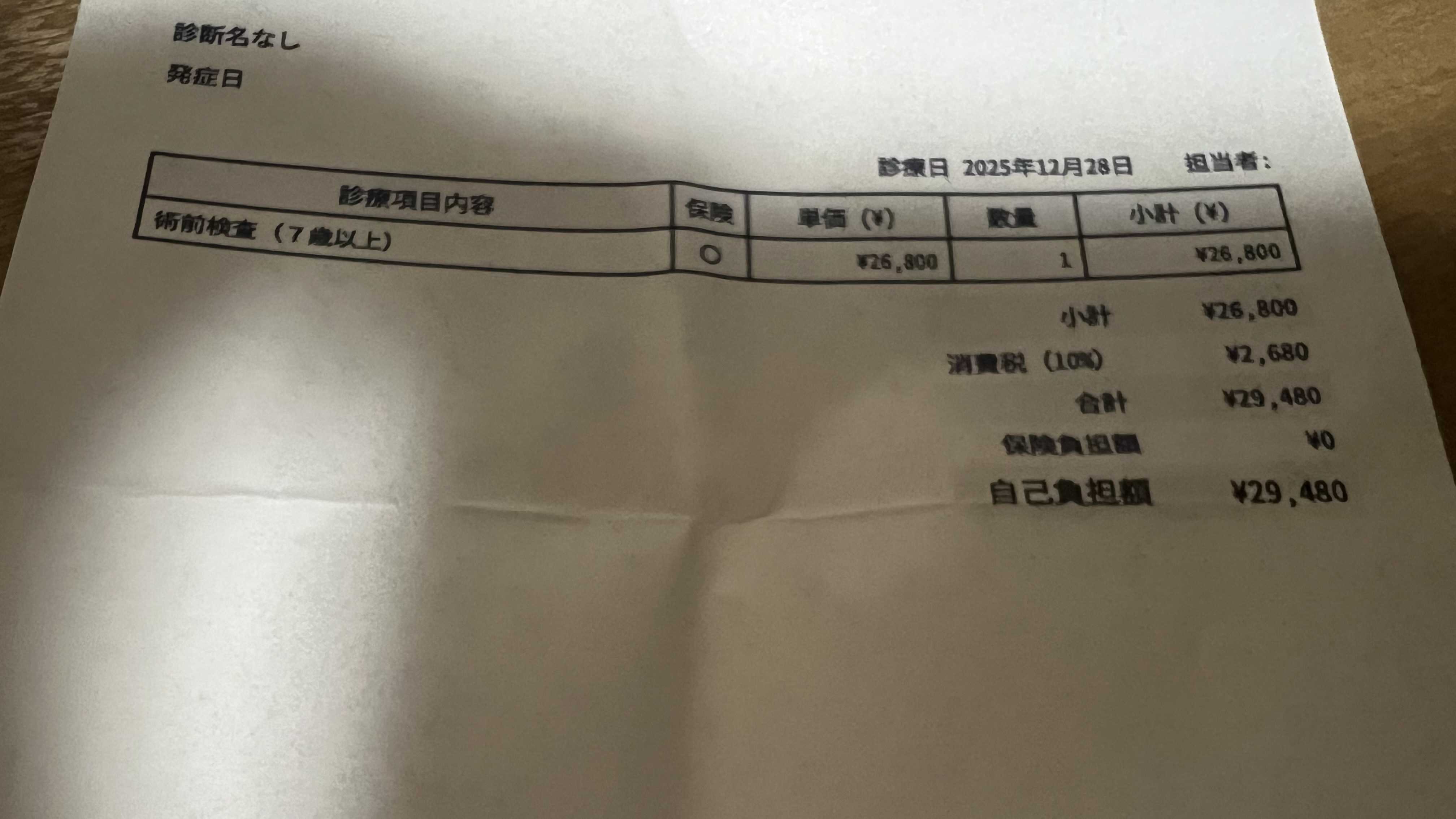 トパ、基礎健康診断を予約して病院に行ったのですが… ![]() 2〜3年前に先生が、歯石はついてるけど2025年にもう一度相談しましょうと言っていたので、ど年末ですが健康診断ついでに相談しました ![]() そしたら、すごいついてるわけじゃないけど、もし取るなら麻酔かけるので、年齢的にこのタイミングかなーと… 健康診断ではなく、術前検査に切り替えました なのでエコーもレントゲンもやったので、まぁ少し細かい健康診断みたいなもんですね だと思ってたけど、どこもかしこも健康でした ![]() 術前検査料金↓ ![]() 早くても来月半ばの予約になってしまうそうですが、1番早いとこで予約しました ついでにアーの点滴セットが無くなるので、また3ヶ月分もらいました ただ、先生が、続けるなら針を箱で渡しちゃいましょうか?と聞いてくださったので、もらうことにしました で、この料金↓ ![]() 次回は針は要らないかな… 点滴は私1人で出来るようになりました ![]()