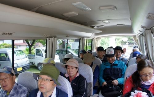 参加者一人ひとりを事務局が紹介してマイクロバスで登山口の有る肝煎集落まで移動します。