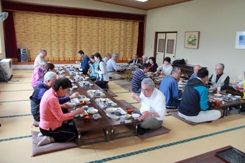祝辞の次に事務局の小林が日程の概要を説明しました。参加者のアンケートに『山歩きで汗をかき、風呂に入ってさっぱりしたところで午後からまた歩くのは辛かった』との意見を受け、今年はこれまでと違い、午後からの清川散策を「歴史の里清川」のスライド鑑賞に変更したことの説明がありました。