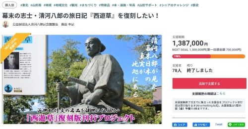 携帯からもアクセス☞![]() ■ 昨日午後11時をもって本事業の締め切りとなりました。その結果、最終的に1,387,000円、ご支援頂いた人数は総数で185人になります。ネットからご支援頂いた皆様、銀行振り込みをして頂いた皆様、そして直接記念館にお持ち頂いた皆々様誠にありがとうございました。心から御礼申し上げます。 清河八郎に寄せる皆様の想いを熱く受け止め、今後も記念館事業を展開してまいります。これからも引き続きご声援をお願い申し上げます。 尚、所得控除証明書については、これからリターンと同時にお届けする準備に入ります。しかしその使用時期についてですが、証明書の発行は本事業が成立した時点(当初目標700,000円、1月8日(水))で発行可能になるとの指導を受けておりますので、日付は1月8日(水)になります。よって昨年ご支援頂いた方でも来年の確定申告に提示して頂きますようお願致します。 皆様誠にありがとうございました。 お気に入りの記事を「いいね!」で応援しよう