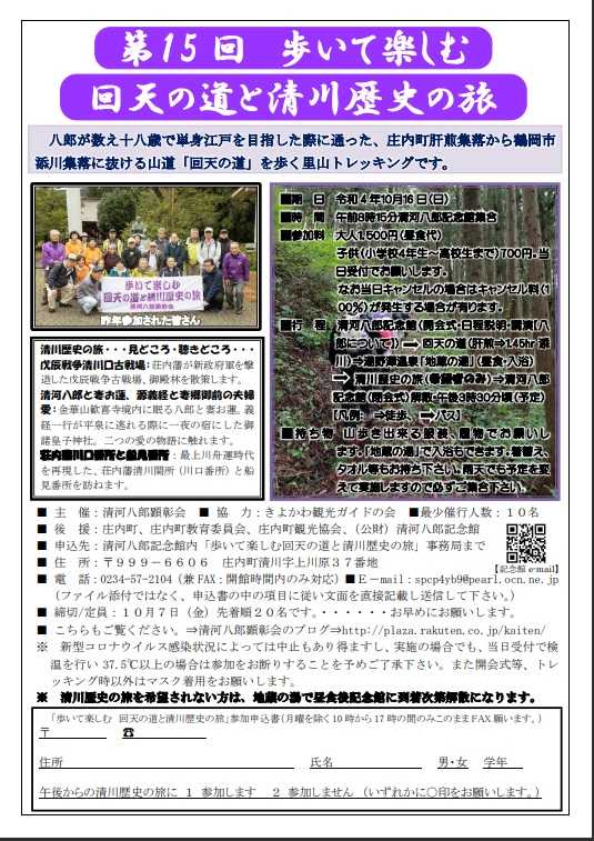 新型コロナウイルスが全国に広がっている現状で、皆様も自粛、自重の生活を強いられていることと思います。 本事業の開催にあたり組織内での検討会の結果、国や、行政での行動制限が発出されていないこともあり、また屋外での活動によるリフレッシュ効果も期待し、感染拡大防止に最大限の注意を払いながら実施することといたしました。 本事業は毎年締め切り前に定員に達している事業ですので、早めにお申し込み頂くことをお勧めいたします。 概要は次のとおりです。 1主 催:清河八郎顕彰会 2後 援:庄内町、庄内町教育委員会、庄内町観光協会、(公財)清河八郎記念館 3協 力:清川観光ガイドの会 4開催期日:令和4年10月16日(日) 5開催場所:清河八郎記念館集合、解散 6事業内容:午前8時15分清河八郎記念館に集合し、開会式の後、記念館廣田館長から八郎についての講話になります。次に約1時間45分回天の道を散策し湯野澤温泉「地蔵の湯」で入浴、昼食となります。午後の清川散策は、リピータ―の方の意見を踏まえ希望制としています。 雨天の場合は「回天の道」トレッキングは危険防止のため中止し、記念館での八郎に関する講話と、2019年に顕彰会で作成した「歴史の里清川」のDVD鑑賞及び本年庄内町で新たに作成した「回天の魁士清河八郎」の動画鑑賞とします。終了後湯野澤温泉「地蔵の湯」に移動し昼食と入浴をしてもらい再び記念館に戻り解散になります。 7参加定員 :20名(最少催行人数10名) 8参加料金 :大人1,500円(当日キャンセルの場合はキャンセル料100%お願いします。) 9申し込み :清河八郎記念館(電話:57-2104)FAX兼用ですが、時間外は お気に入りの記事を「いいね!」で応援しよう