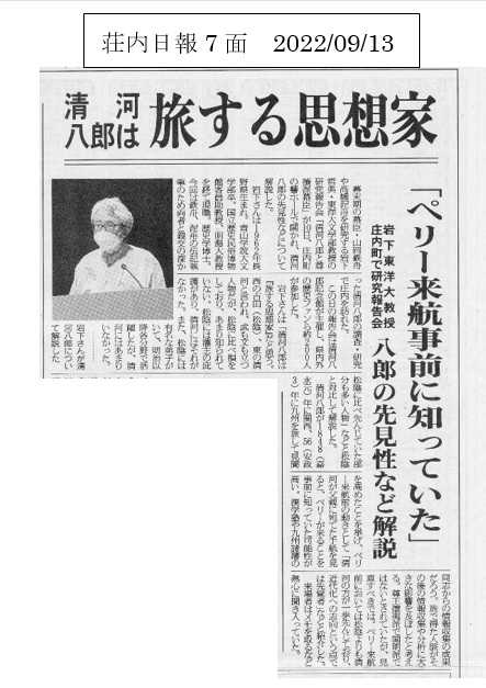 ▼ 新型コロナウイルス感染症拡大防止を図るため、参加者の検温、密になることを防ぐ為町内、町外参加者の導線分離、アルコール消毒の徹底に努めました。 ![]() ![]() ![]() ▼ 報告会が始まる前に、庄内町で最近製作したDVD「明治維新の魁清河八郎 幕末の扉を開けた草莽の志士」が上映されました。 ![]() ![]() ![]() ▼ 開会式風景 ![]() ▼ 主催者挨拶 公益財団法人清河八郎記念館理事長 田澤伸一 ![]() ▼ 共催者紹介 写真向かって右から、主催者公益財団法人清河八郎記念館理事長田澤伸一、共催者、庄内町長富樫透(清川まちづくりセンター)、齋藤満(清河八郎顕彰会会長)、庄内町教育長佐藤真哉(清河八郎大河ドラマ誘致協議会) ![]() ▼ 共催者を代表して庄内町長富樫透の挨拶 ![]() ▼ 講師紹介をする清河八郎記念館廣田幸記館長 ![]() ▼ 岩下哲典教授の講演 ![]() ![]() ![]() ![]() ![]() ![]() 昨日到着し、清河八郎記念館を訪れた。現在特別企画展で展示されている生家齋藤家が荘内藩への献金として献上した金額が約4029両であるとされていた。現在で約2億円に近い金額になると思う。清川は関所が設けられており、人、物、金、情報の結節点であったと思う。記念館の展示は2次元展示になっており、清河塾や、生家齋藤家、藩主御殿等の平面図があることから、3次元的な立体展示が出来ると内容が濃くなる。8年後の生誕200年にリニューアルした記念館が完成できることを期待したい。名称も「旅する思想家 清河八郎歴史館あるいは清河八郎記念館」が考えられる。 庄内町教育委員会で2015年に編集した「清河八郎関係書簡 三」の中に収められている嘉永6(1853)年1月17日付父宛書簡から、清国と英国とのアヘン戦争の結果からも、外国の武力は容易ならざるものがあり、わが国では「思慮」あるべきと結んでいる。 八郎がペリー来航を事前に知っていた可能性が高い。それは東条一堂や安積艮斎の漢学塾で学んだことや、嘉永3(1850)年に九州方面に旅した時の人脈からの情報と思われる。 ▼ 山形新聞10面(2022/09/11)で紹介して頂きました。 ![]() ▼ 荘内日報7面(2022/09/13)で紹介頂きました。 ![]() お気に入りの記事を「いいね!」で応援しよう