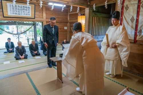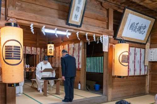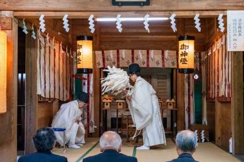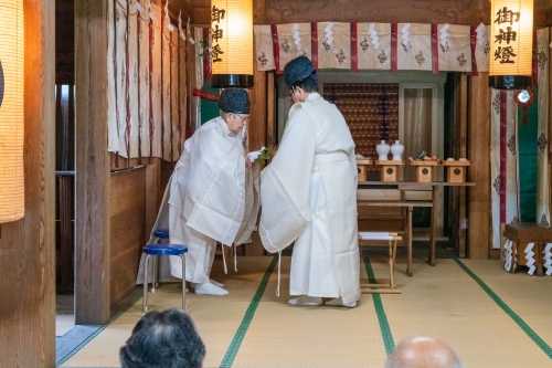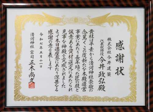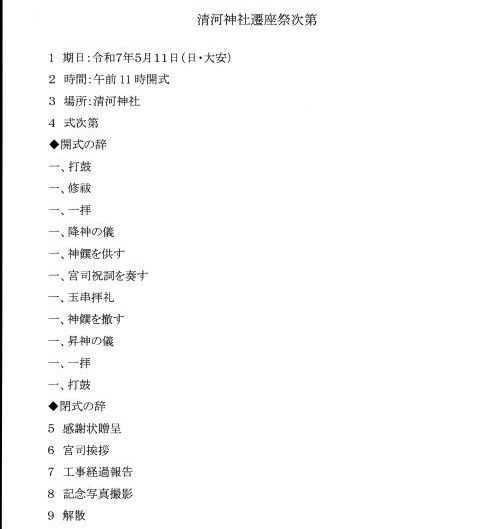 清河神社が創建されたのは昭和8年、今から92年前になります。屋根は銅板葺きになっていますが、雪国清川の冬は厳しく、毎年繰り返される落雪により銅板が摩耗し、平成26年には冬季間の凍結融解による浸透水から、屋根構造材の損傷による修理を余儀なくされ、さらに近年は、内陣への雨漏り被害が懸念される様にになっていました。 新しい銅板で葺き替えると高額な経費が必要になることが判明し、神社役員会で度重なる協議の結果、将来の維持管理も考え神社の自己資金の範囲内で、直接雨風、雪からの影響を受けない覆殿方式を用いたささやかな本殿を新築するのが最良の結果であるとの結論に達しました。 工事は、株式会社今井建築が請負、令和6年9月1日に着手、同年11月19日に完成しています。 ▼拝殿と旧本殿への渡り廊下に新設なった新本殿 ![]() ![]() ▼姿図 ![]() 木材は無垢の杉で無節を基本にし、階段は欅材を使用しています。大きさは、高さ、幅、それに奥行き何れも1.8mで、ご神体を祀る神棚部分は高さ76㎝、幅1.8mになっています。 ▼遷座祭次第 ![]() ![]() ▼当日捧げた神饌 ![]() ![]() ▼打鼓:儀式の始まりを知らせる太鼓の軽快な音が拝殿に響きます。 ![]() ![]() ▼修祓 ![]() ![]() ![]() ![]() ▼降神の儀:警蹕、開扉 降神の儀 警蹕:「お~~!、お~~!」と斎主が声を発し御霊をお招きします。 開扉:徐に本殿の扉を開きます。 ![]() ▼宮司祝詞を奏す ![]() ![]() ▼玉串奉奠 最初に正木尚文宮司、次いで渡邊和能清河神社責任役員代表、それに工事の受注者である、今井政弘株式会社今井建築代表取締役が捧げました。 ![]() ![]() ![]() ![]() ▼昇神の儀:警蹕、閉扉 警蹕:「お~~!、お~~!」と斎主が声を発し御霊を元の御座にお帰り頂きます。 閉扉:徐に本殿の扉を閉じます。 ![]() ▼打鼓 儀式の終了を告げる太鼓の音が拝殿に響きます。 ![]() ▼感謝状贈呈 工事受注者である今井政弘株式会社今井建築代表取締役に正木尚文宮司から感謝状の贈呈を行いました。 ![]() ![]() ![]() ![]() ▼宮司挨拶 挨拶概要 「いま、八郎様さいてくる~。」そんな言葉を家族に残し、ここでよく遊んだものです。「八郎様」とは清河神社に親しみを込めて呼んでいたもので、今なお「八郎様」と呼んでいる人が多いと思われます。 さて、昨年回覧で地区の皆さんにもお知らせしましたが、本殿屋根下地の腐敗が進み、早急に補修する必要があったのですが、屋根全体を復元するとなると、一千四百万円を超えることが分かった訳です。 最近の地区の世帯減少、高齢化などの現状を勘案し、自己資金の範囲で新たな本殿を造ることになり、お陰様で竣工にこぎ付けました。「八郎様」には申し訳ないのですが、現状をご理解頂きまして、今後ともご加護の程をお願いし、御礼したいと思います。 ![]() ▼新本殿竣工記念撮影 ![]() ![]() お気に入りの記事を「いいね!」で応援しよう