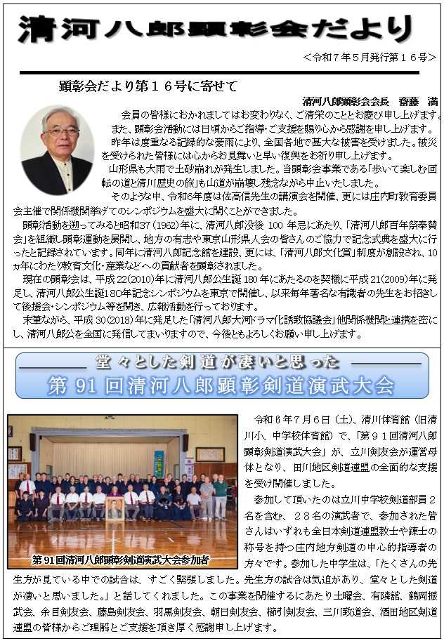 令和4年度清河八郎顕彰会会員募集のお知らせです。 本会は、国情騒然たる幕末期に「回天倡始」をいち早く唱え、時代を魁た歴史的偉傑であり明治維新の幕を開けた男、郷里が生んだ清河八郎公の行動力と信念を顕彰し、後世に伝えていくことを目的に、平成21年3月に発足しました。 本会の活動は、主催事業として「歩いて楽しむ回天の道と清川歴史の旅」、「文武体験子ども塾」、それに「清河八郎剣道錬成会」を毎年実施していますが、昨年と一昨年は新型コロナ感染拡大防止を図るため、やむなく中止した事業もあります。 その他、清河八郎公の偉業を伝えていく核となる「清河八郎記念館」の運営への協力や、文武両道の神として清河八郎公を祀る「清河神社」例大祭の斎行に協力しています。 また昨年(令和3年)取り組んだ「清河神社大鳥居修復事業」では、清川地区振興協議会や清川地区自治会長会それに清河神社役員会と一体になり、風化が激しかった大鳥居を建立当時の風格ある姿に蘇らせる事業の中心的役割を果たしました。 本会の会計は、次の決算書のとおり主な収入は会員皆様からお寄せ頂いた会費になります。令和2年度月山フォーラム「月山わくわく活性化事業」は単年度事業で、清川関所敷地への回天の道案内看板や、回天の道の危険個所解消事業、八郎が江戸に出奔した際の書置きや日記文を紹介した看板設置等を行いました。令和3年12月31日現在の会員数 皆さんも是非本会の活動を支援する一人に加わって下さい。活動に賛同して頂ける方は次の連絡先にご一報頂ければ幸いです。① 清河八郎記念館【mail:spcp4yb9@pearl.ocn.ne.jp】】(但し、12月1日~2月末日は休舘ですのでその際は②にお願いします。)② 清河八郎顕彰会事務局【mail:komasa@jan.ne.jp】注意:どちらへのメールもファイル添付(安全の為削除する場合があります。)はお断りしております。件名は「会員申し込み」として頂き、本文にお名前、連絡先をベタ打ちでお願いします。 会費は一口1,000円からになります。上限はありません。 ■正会員1,000円~ ■賛助会員5,000円~ ■特別会員10,000円~ ■篤志会員(多額の金品を寄附し功労のある方)※ ご連絡頂きますと、入金に必要な振替用紙(手数料は本会負担)をお送りしますし、後日、全員に会員証、また賛助会員以上の方には記念品をお贈りいたします。