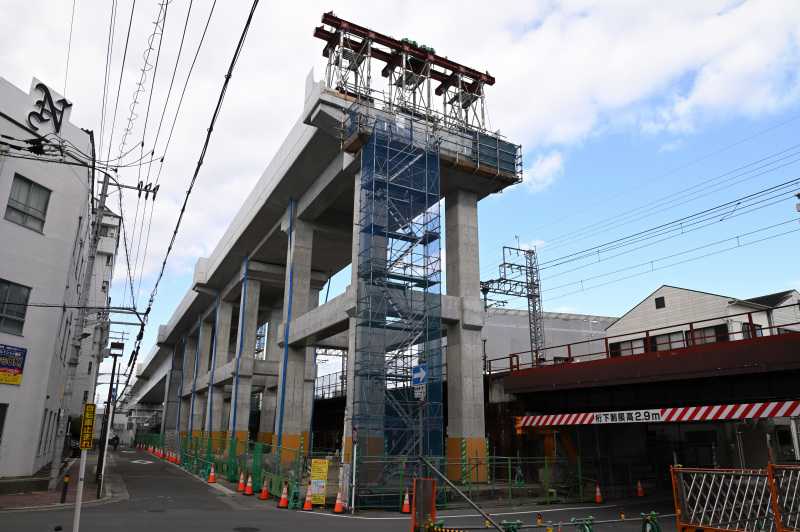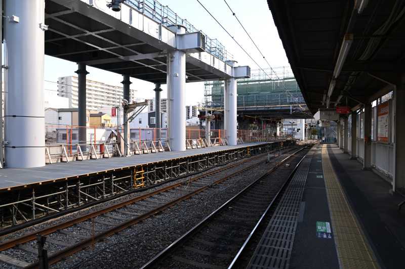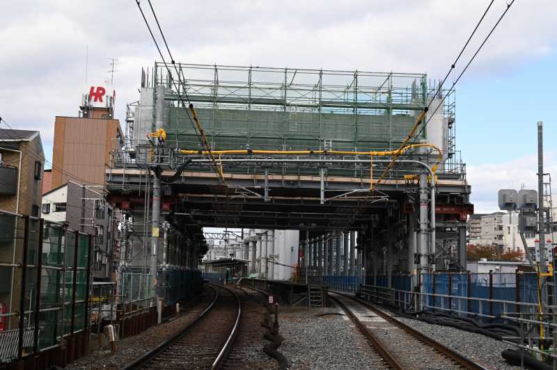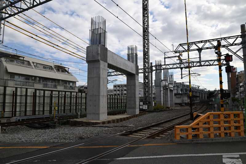 ![]() こんにちは。こんばんは。 下新庄駅の11月の様子をレポートします。 1枚目は五田名北踏切から見た下新庄駅です。 橋脚が門形になり完成しました。この後ステージ解体の準備を始めるようです。 ![]() 2枚目は旧淡路行ホーム淡路側です。 仮ホームの合板部分は概ね完成したようです。 ![]() 3枚目は同じく旧淡路行ホーム屋根のある部分です。 こちらは整地されていますが、まだ土が露出した状態です。 ![]() 4枚目は下新庄踏切の淡路側です。 足場などが外され橋脚が姿を現わしました。 ここはしばらくこの形でいくようです。 ![]() 5枚目は下新庄踏切北の道路部分北千里側です。 図面にこの橋梁が「仮井戸口橋梁」と表記されていたので次回からこの名称を使用します。 桁架設用のクレーンが設置されました。まもなく桁架設を行うようです。 ちなみに反対側はまだクレーンが設置されていません。 道路閉鎖を伴うはずなので予告はすると思います。 今月は以上です。来月も引き続きレポートします。 お気に入りの記事を「いいね!」で応援しよう