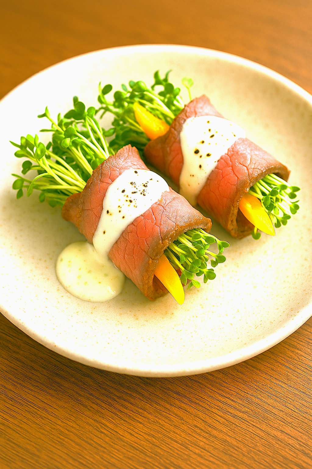 ジューシーなローストビーフでシャキシャキ野菜をくるりと巻いて、爽やかなヨーグルトソースをひとさじ。ブラックペッパーの香りがアクセントになり、噛むたびに肉の旨みと野菜のフレッシュ感が溶け合う、軽やかなごちそうロール。