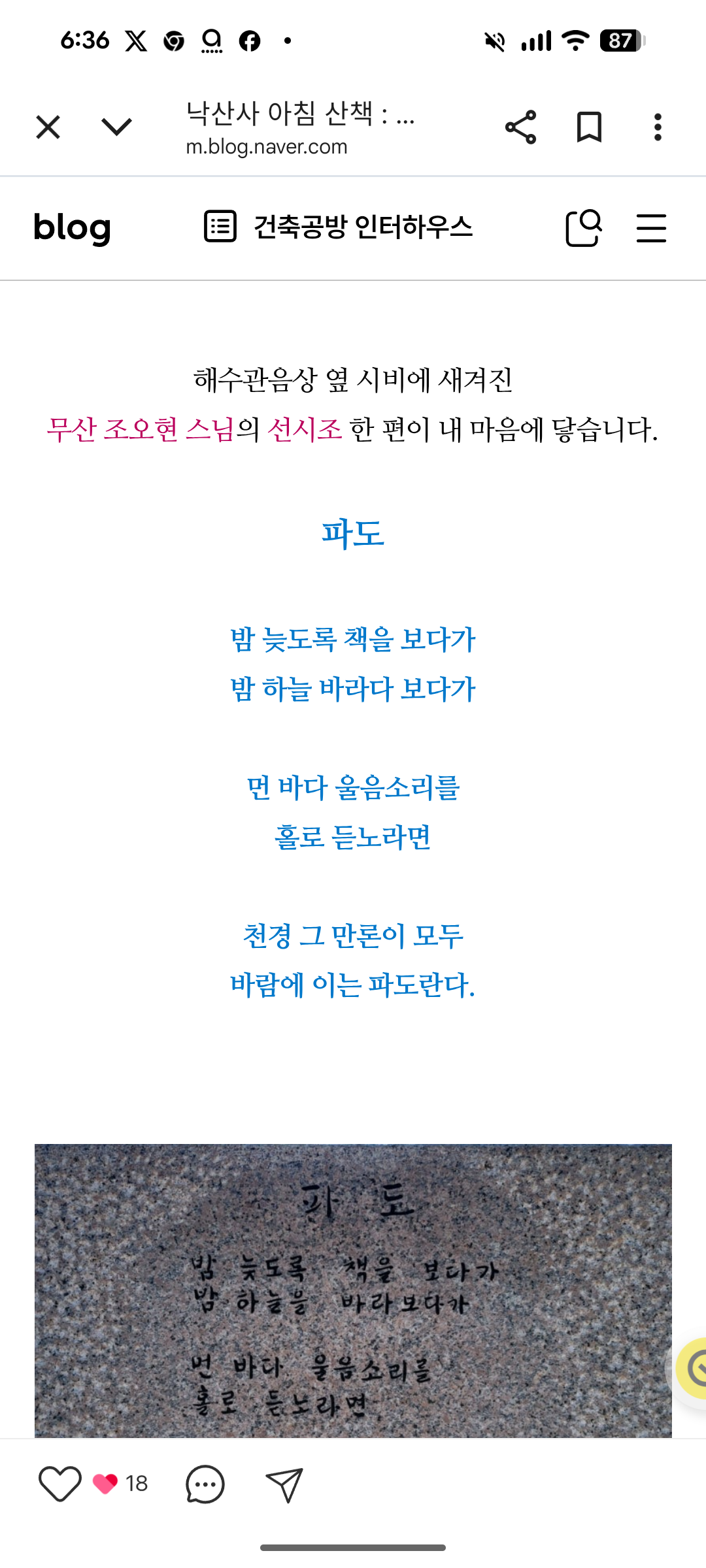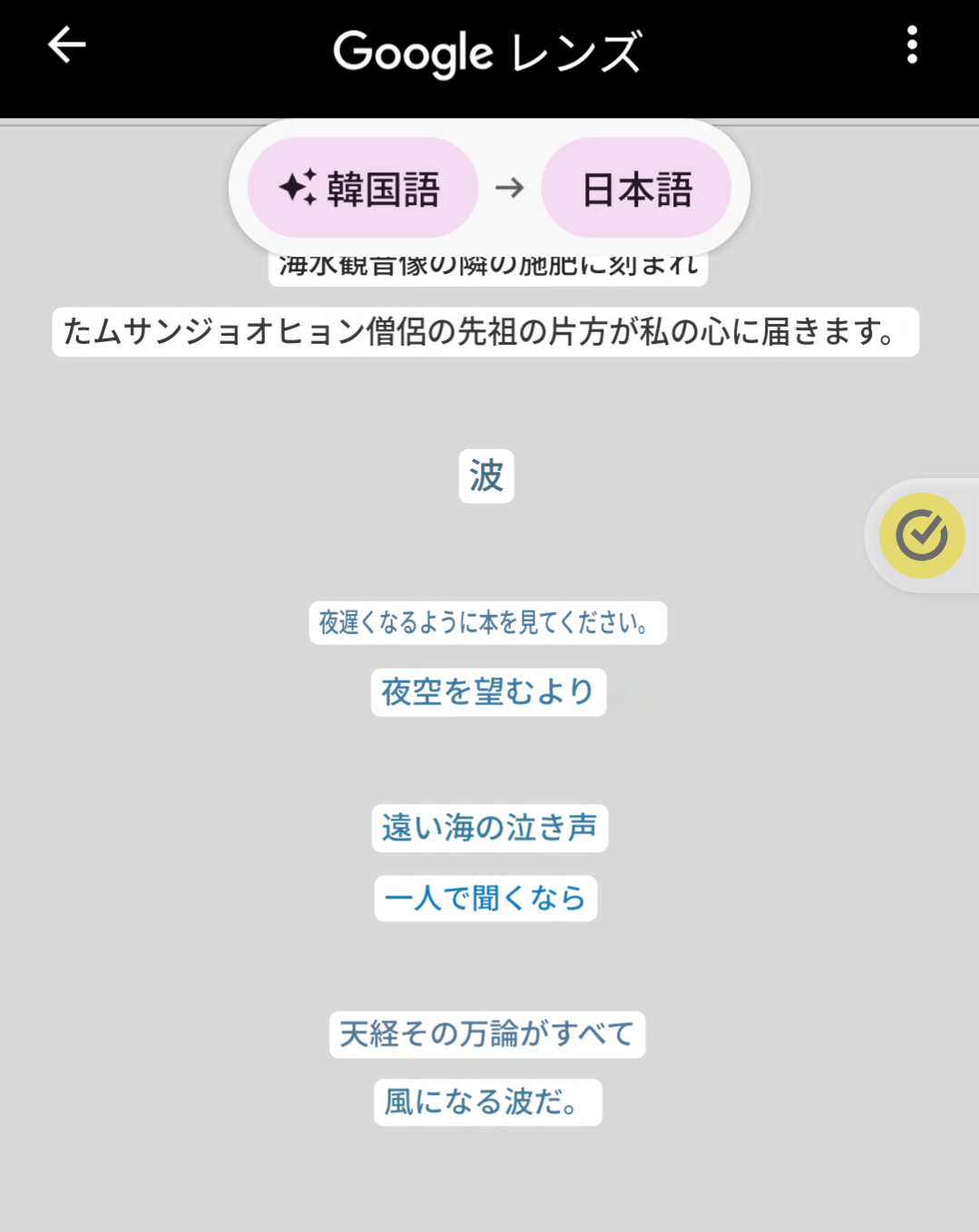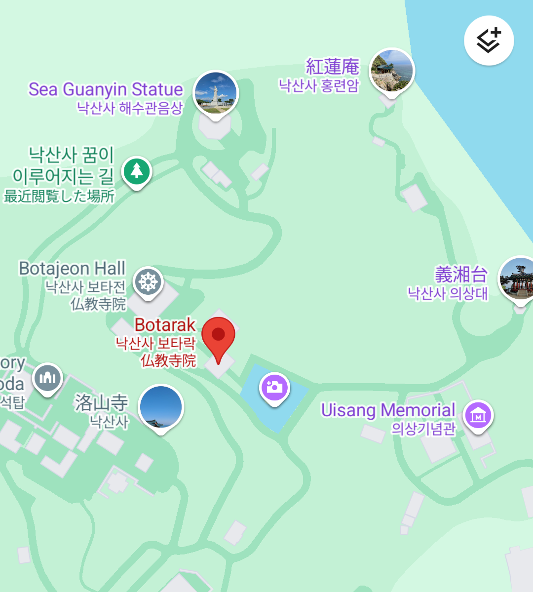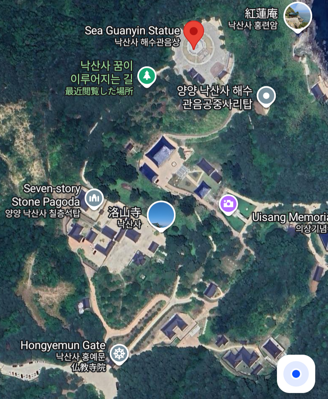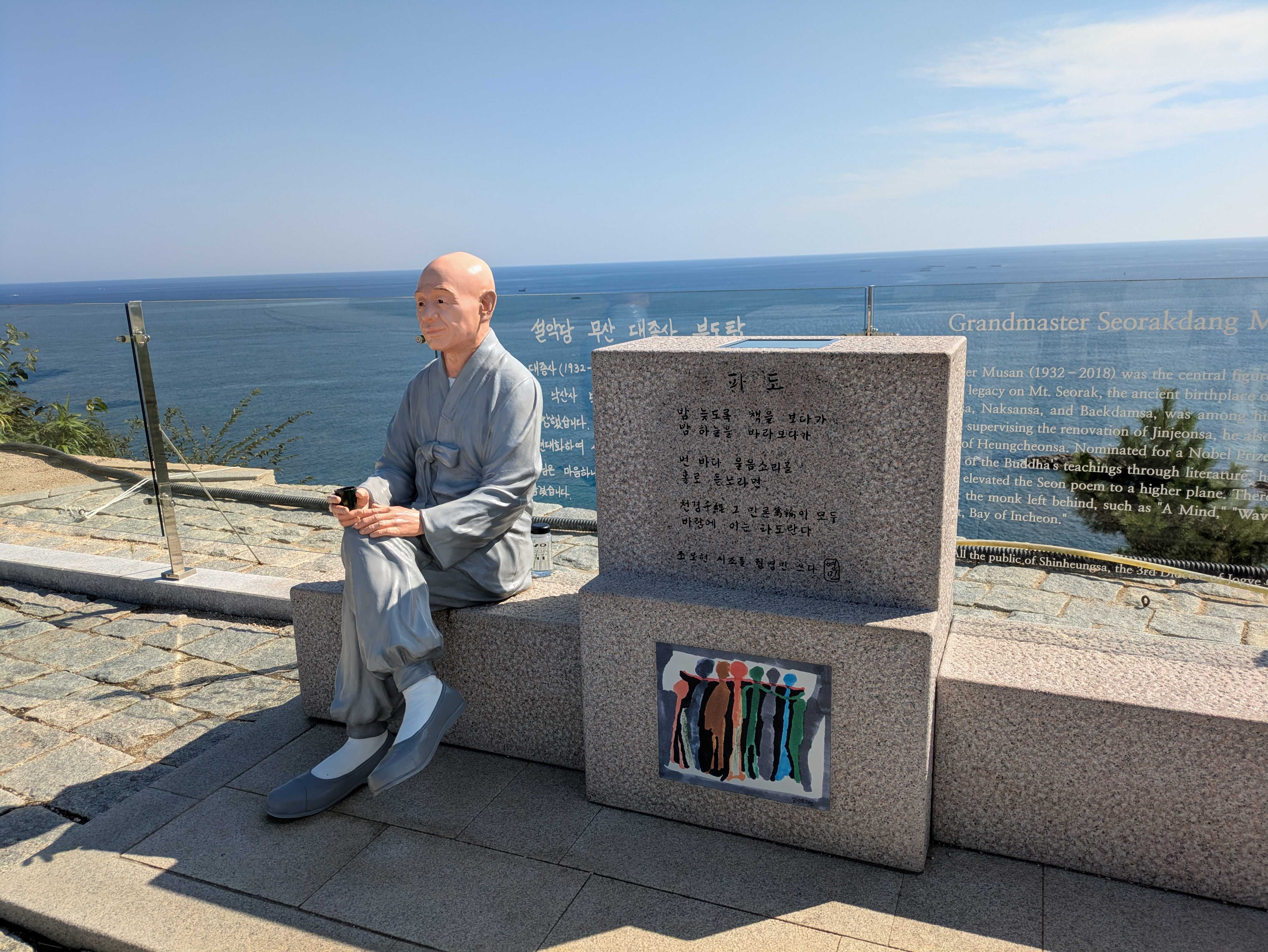 次にはこちら、海水観音像です。 神々しいですね。 赤い印です。 それから こちらは いろいろ検索してみたらこちらのブログでしょうかいされてました。 グーグルさんで翻訳 朝葉は 波動 夜更けに書物を読み 夜空を仰ぐ 遠くの海の泣き声が 一人で聴いてると 天景のこだわりはすべて 風のもたらす波動なり かなかなかな(´ε`;)ウーン… やっぱり、地球は丸いんだなぁと実感。 結構、暑いので、アイスをいただきました。 韓国のアイス、結構好きです。 そして、また、歩きます。 さらに 場所的には