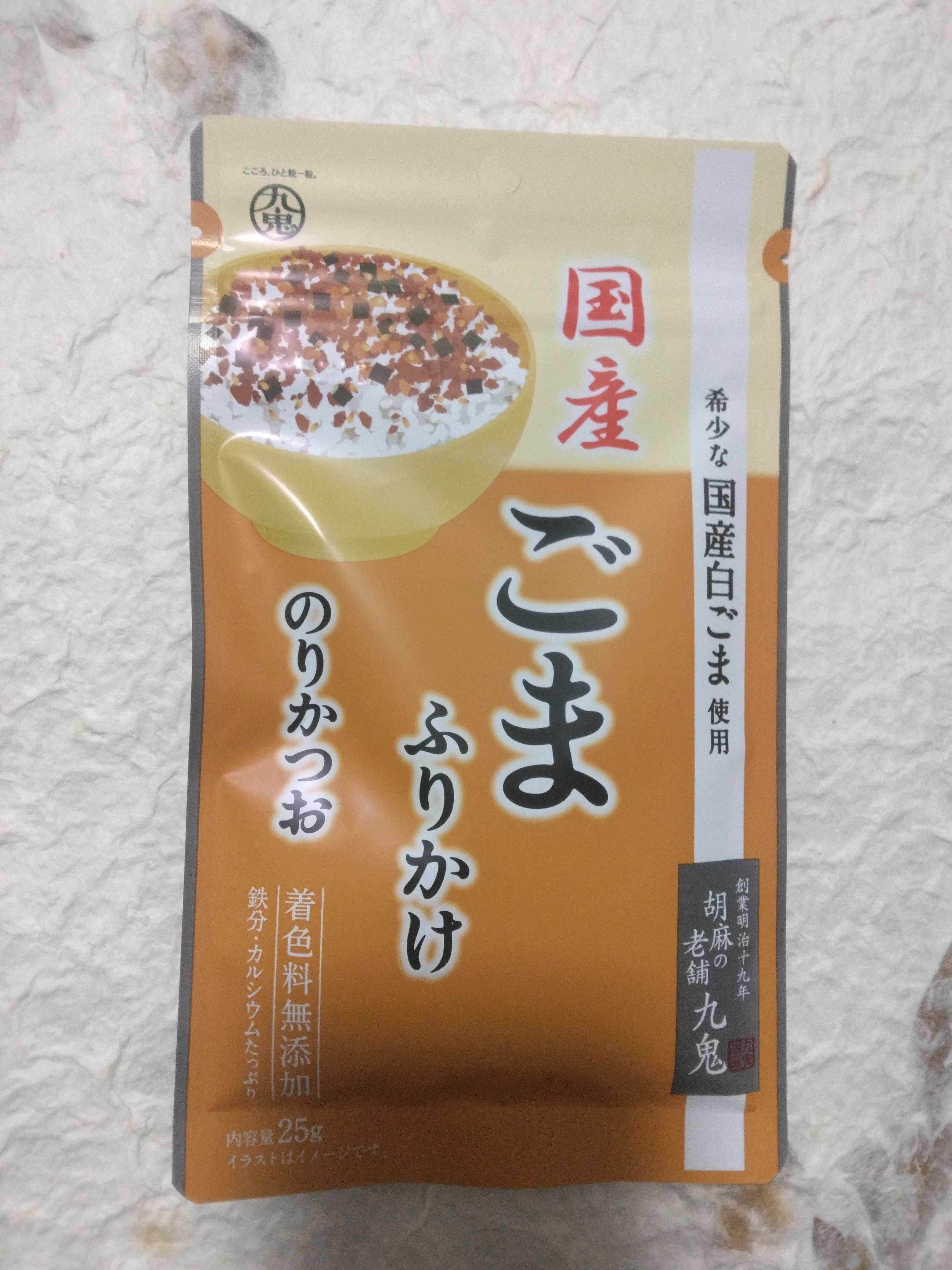 九鬼産業の国産ごまふりかけのりかつおを買ってきました国産の白ごま、かつお節、海苔、塩が使われていて美味しかったです