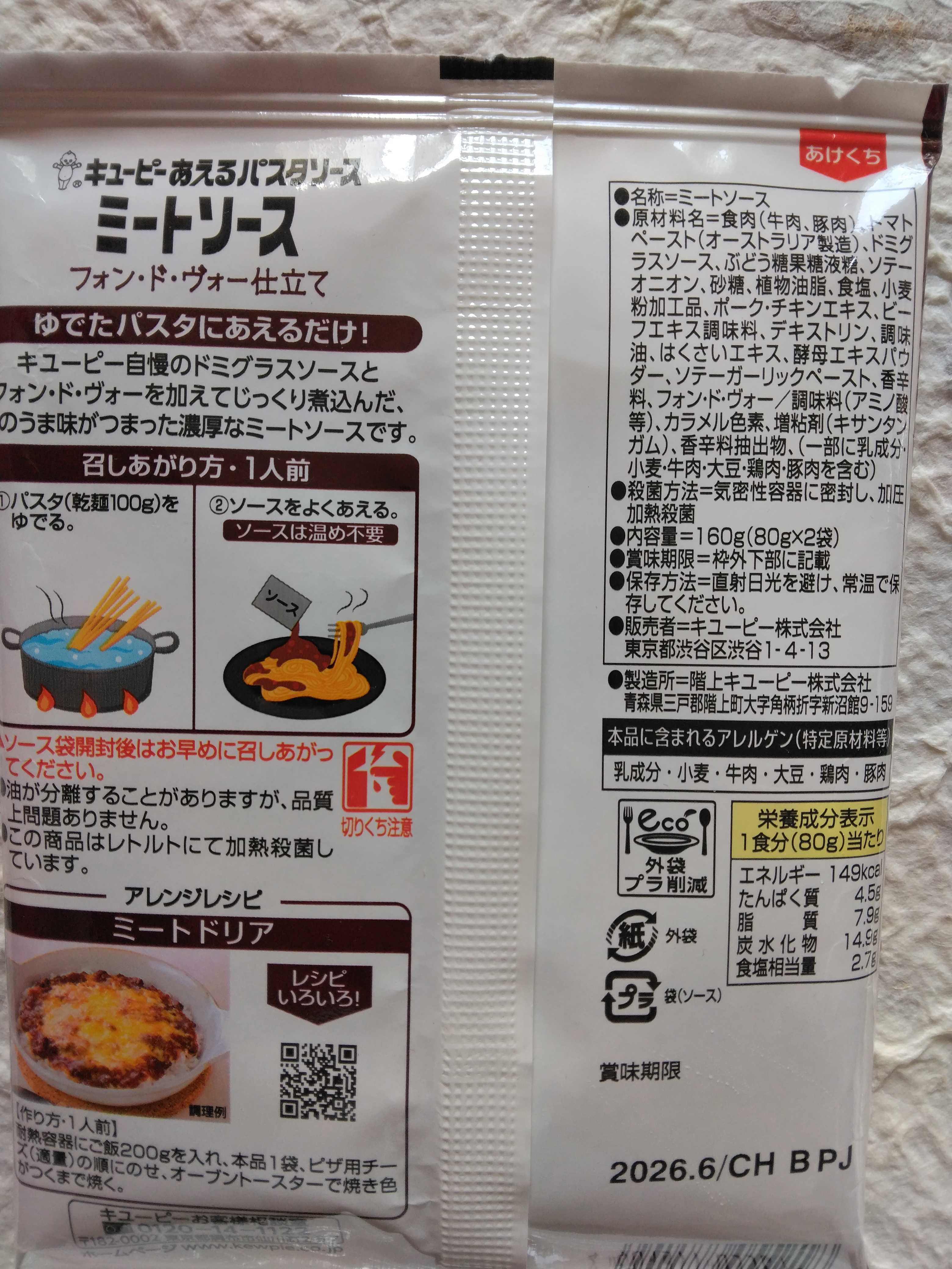 キューピーのあえるパスタソースミートソースフォン・ド・ヴォー仕立てを買ってきました パスタを茹でてパスタソースをかけるだけなので簡単に美味しく作れて良いですね
