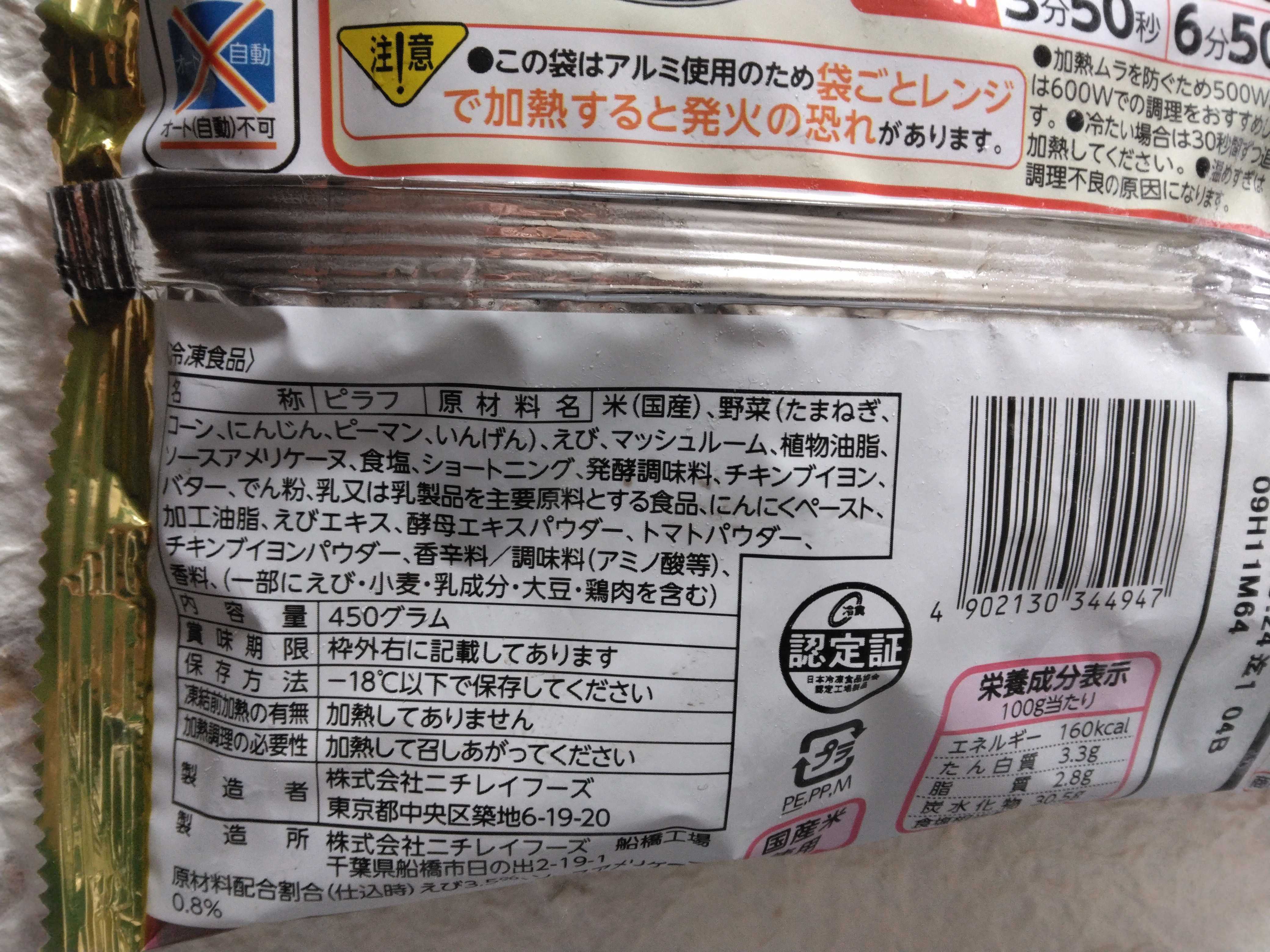 ニチレイのえびピラフを買ってきました ラップをしてレンジで温めました 炒飯と比べて油っぽくなくて美味しかったです [冷凍]ニチレイフーズ えびピラフ 450g