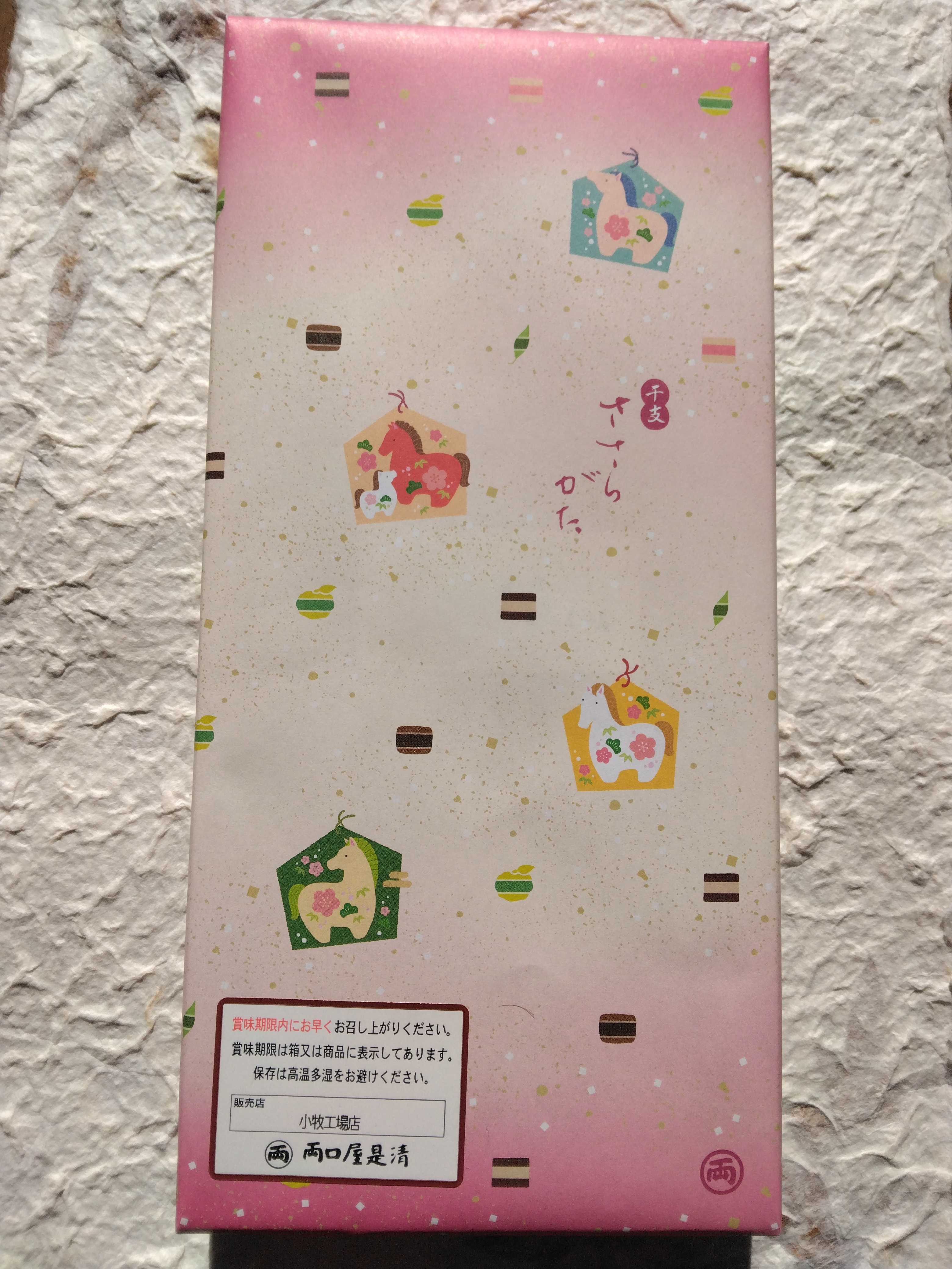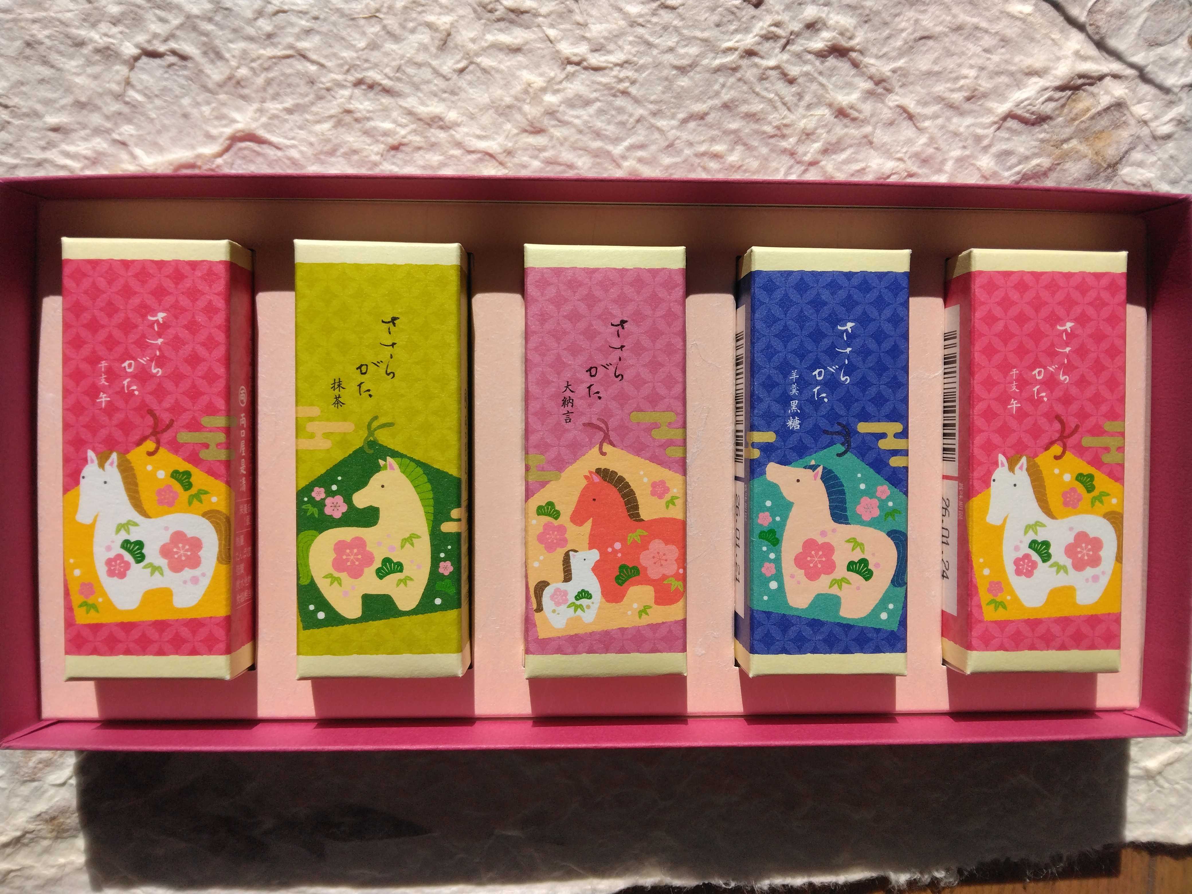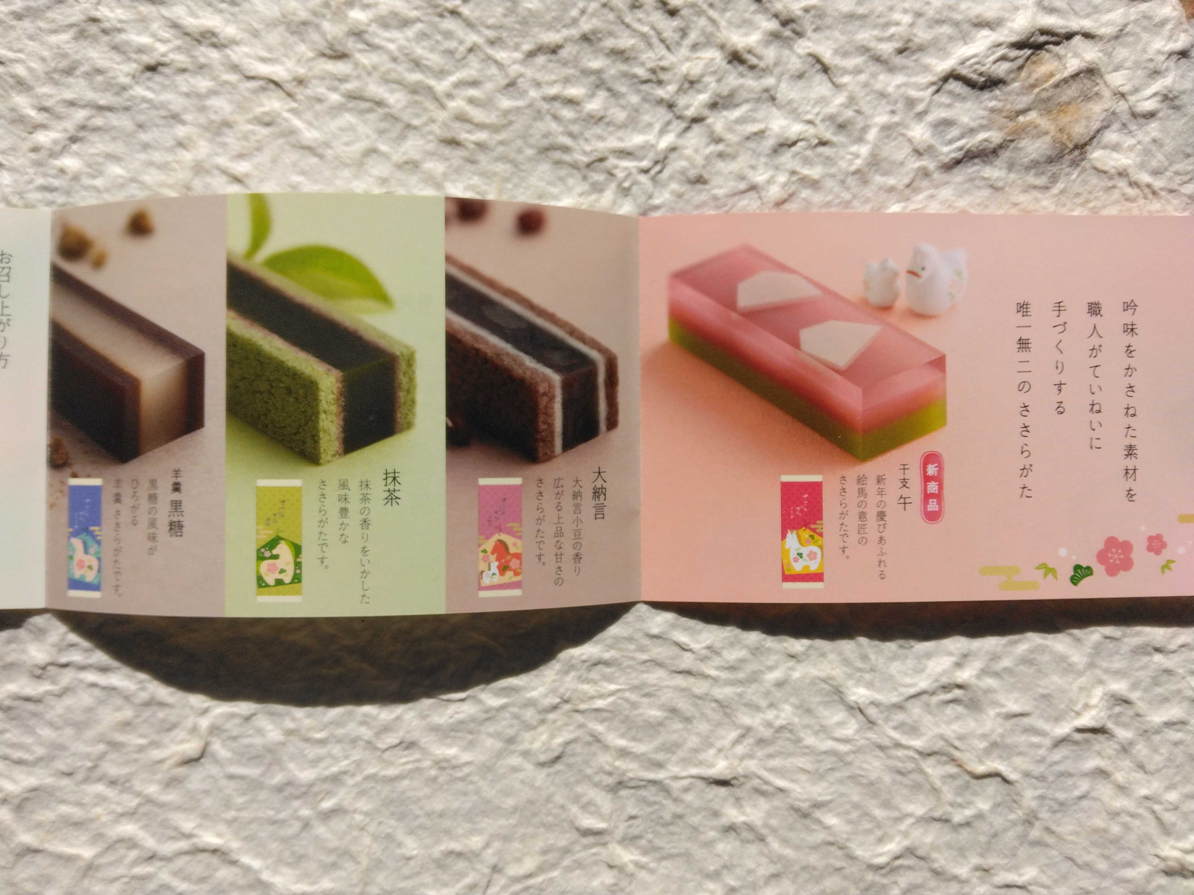 お土産で両口屋是清のささらがたをいただきました 干支午 抹茶 大納言 羊羹黒糖 小分けにされているので食べやすくて美味しかったです
