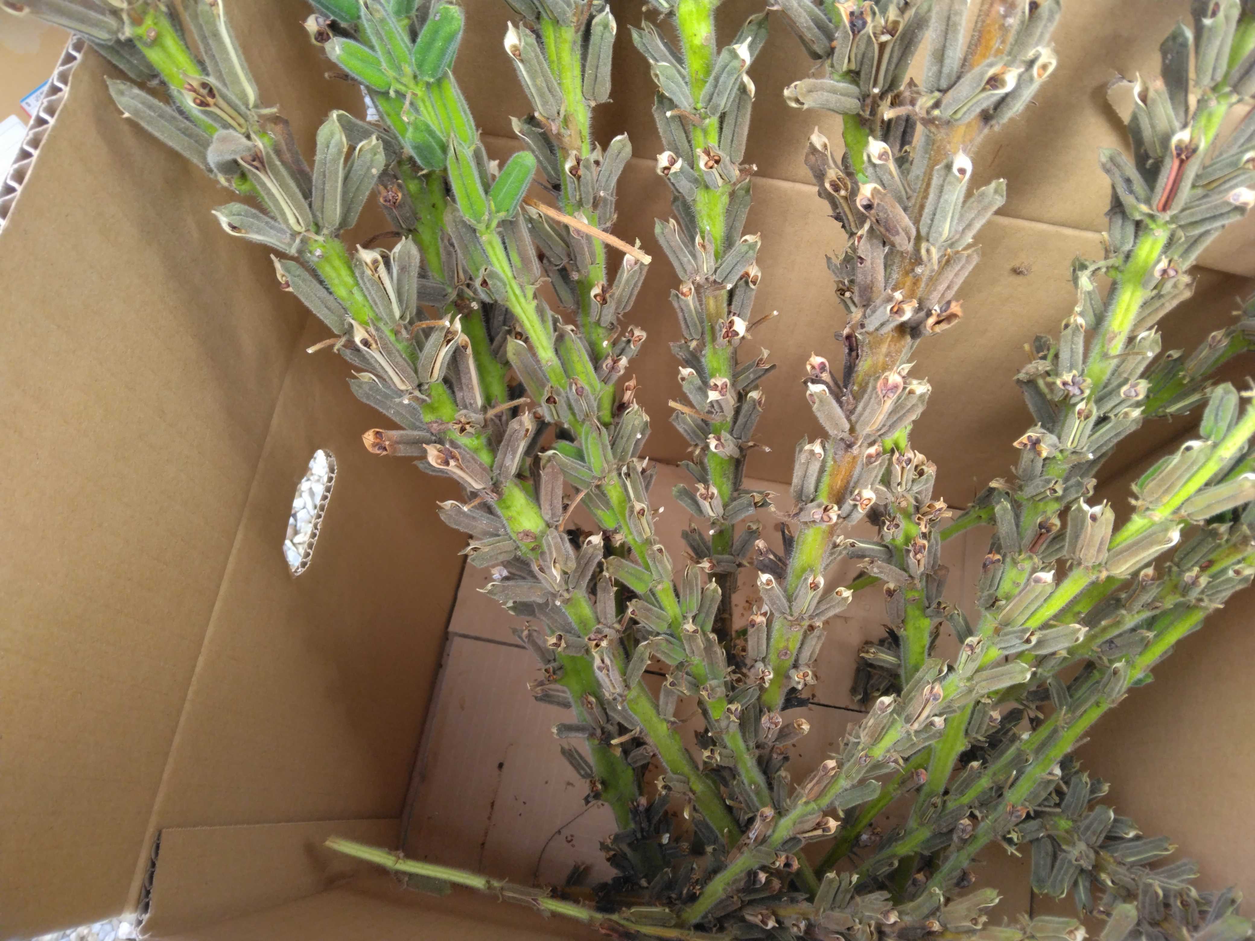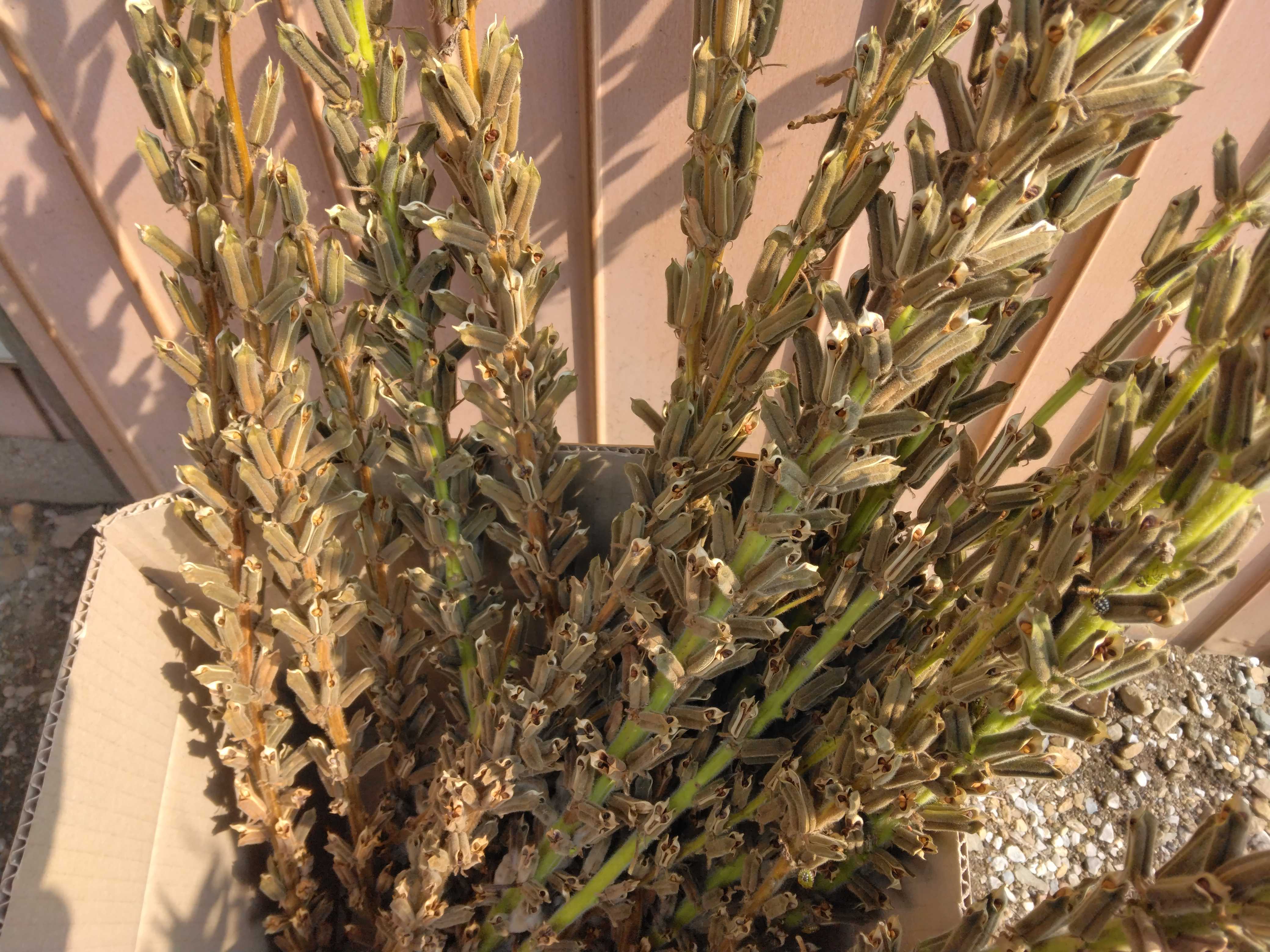 金ゴマの鞘が開いてきたので収穫しました段ボールにゴミ袋を被せましたゴミ袋の中で金ゴマを棒で叩いて種子を落としました網目が大きめの篩で大きいゴミを取り除きました網目が小さい網で小さいゴミをある程度取り除きましたある程度分別した金ゴマを日が当たる場所で干しましたまだゴミが残っているので後日分別したいと思います