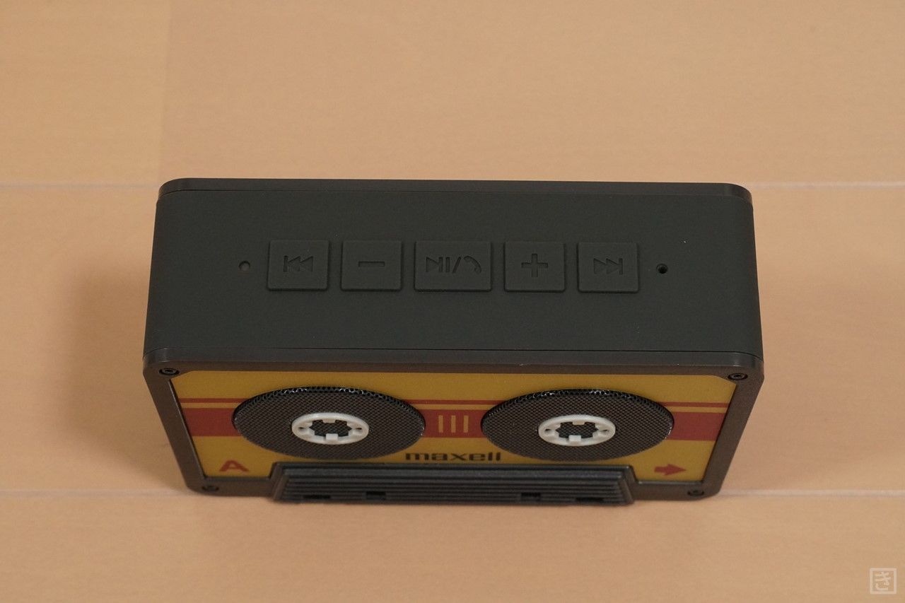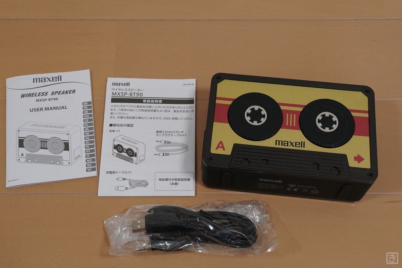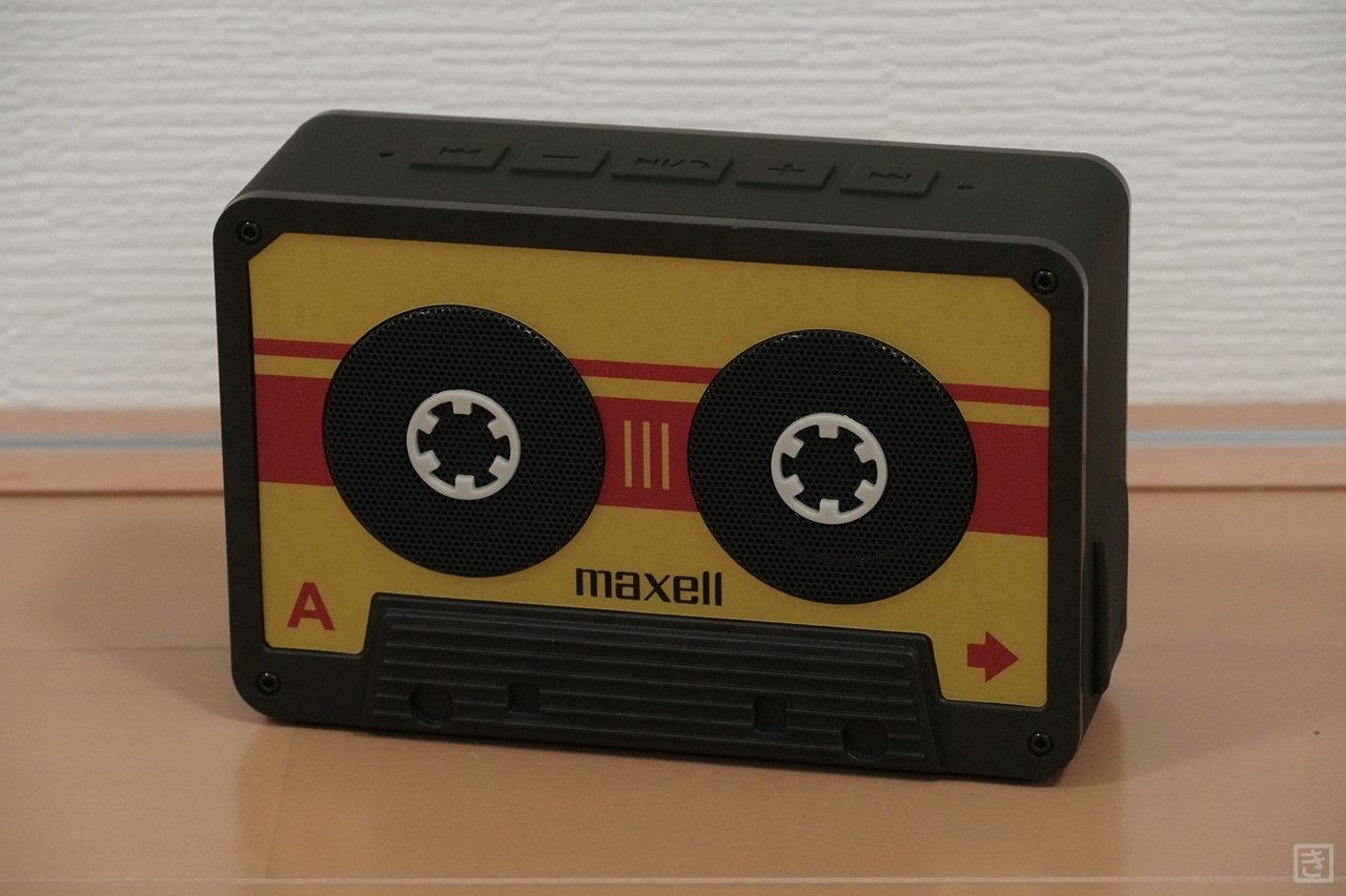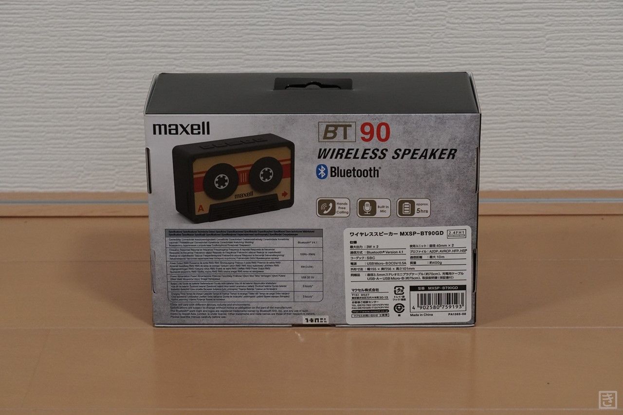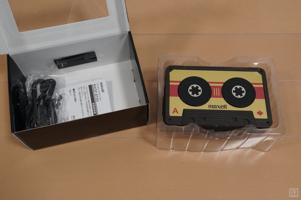 ![]() maxellロゴの箱。 ![]() 購入したのは、マクセルのBluetooth対応ワイヤレススピーカー MXSP-BT90 です。 ![]() カセットテープをイメージしたレトロなデザインのワイヤレススピーカーです。 この佇まいからしてカセットテープにダビングをしていた世代には刺さります。 ![]() 元々海外で企画されたものなので、箱の表示は基本的に英語とその他の外国語。日本語はステッカー対応です。 香港に本社を置くKAN TSANG iNDUSTRIAL CO.Ltd.が作っているようです。 ![]() 中身はこんな感じ。ブリスタートレーに入った本体の下に付属品が入っています。 ![]() 本体と日本語の取扱説明書と、英語とその他の外国語の取扱説明書、そしてUSB充電ケーブルと3.5mmステレオミニプラグケーブルが入っています。 ![]() 本体上面。表示LEDとボタン類、マイクの穴が並んでいます。 シリコンゴムで覆われており、手触り良いです。 ![]() 本体底面。ちゃんと技適マークが印刷されています。 本体裏面にはBと書かれているのもミソ。 ![]() 本体側面にはカバーの下に外部入力端子と電源入力端子があり、シリアルナンバーステッカーが貼られています。 ![]() 充電すると、上面のLEDが赤く点灯します。 ![]() スピーカーとしては割とコンパクトな大きさ。 早速BluetoothでXperia XZ1と接続し音楽を聴いてみました。けっこういい音です。 低音は100Hzからなので響きませんが、女性ボーカルがとてもきれいに出ます。机の上に置いて耳の横で鳴らしてても疲れません。 ↓UDIカラーのシルバーもいいですね。 お気に入りの記事を「いいね!」で応援しよう