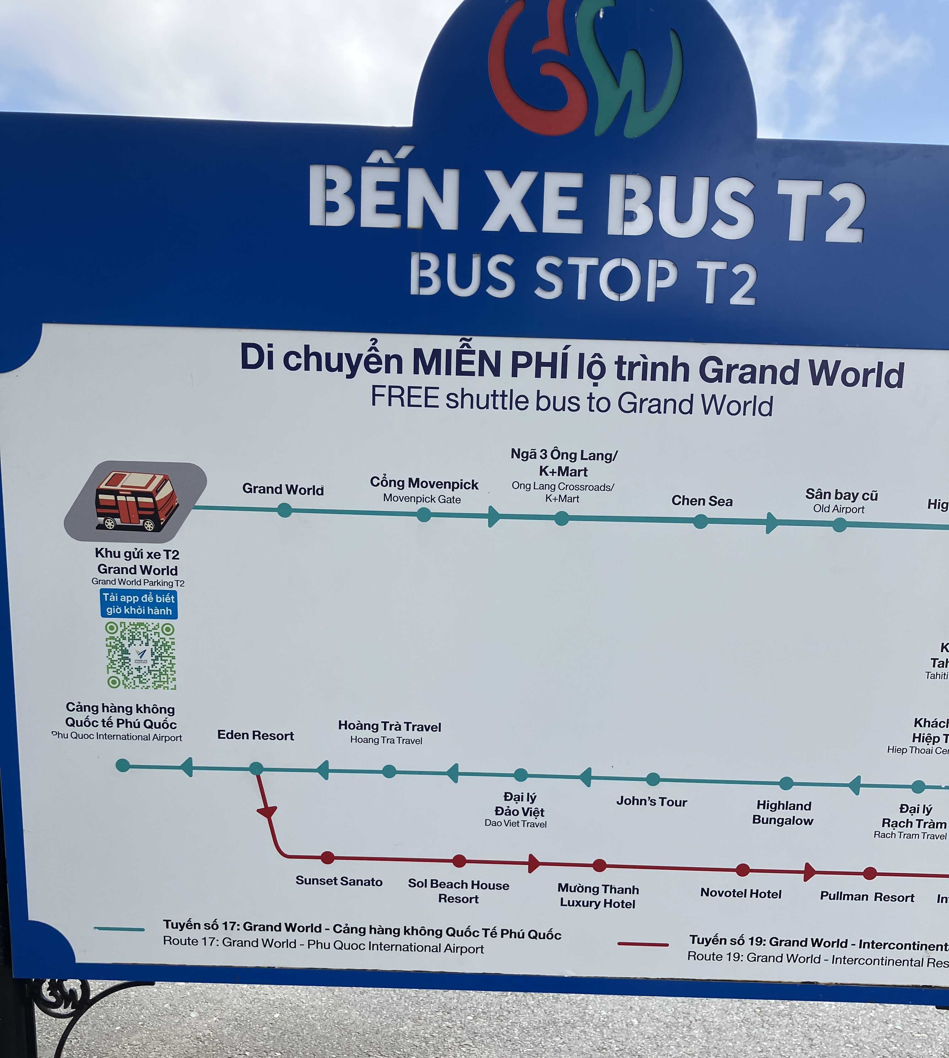 空港からホテルへ向かう途中、緑色の乗り合いバスを見かけたので、ホテル到着後にバス情報を検索すると、フーコック島では空港から市内まで電気バスが無料で運行していることが分かりました。情報不足でしたが、滞在ホテルの近くにもバス停がありました。