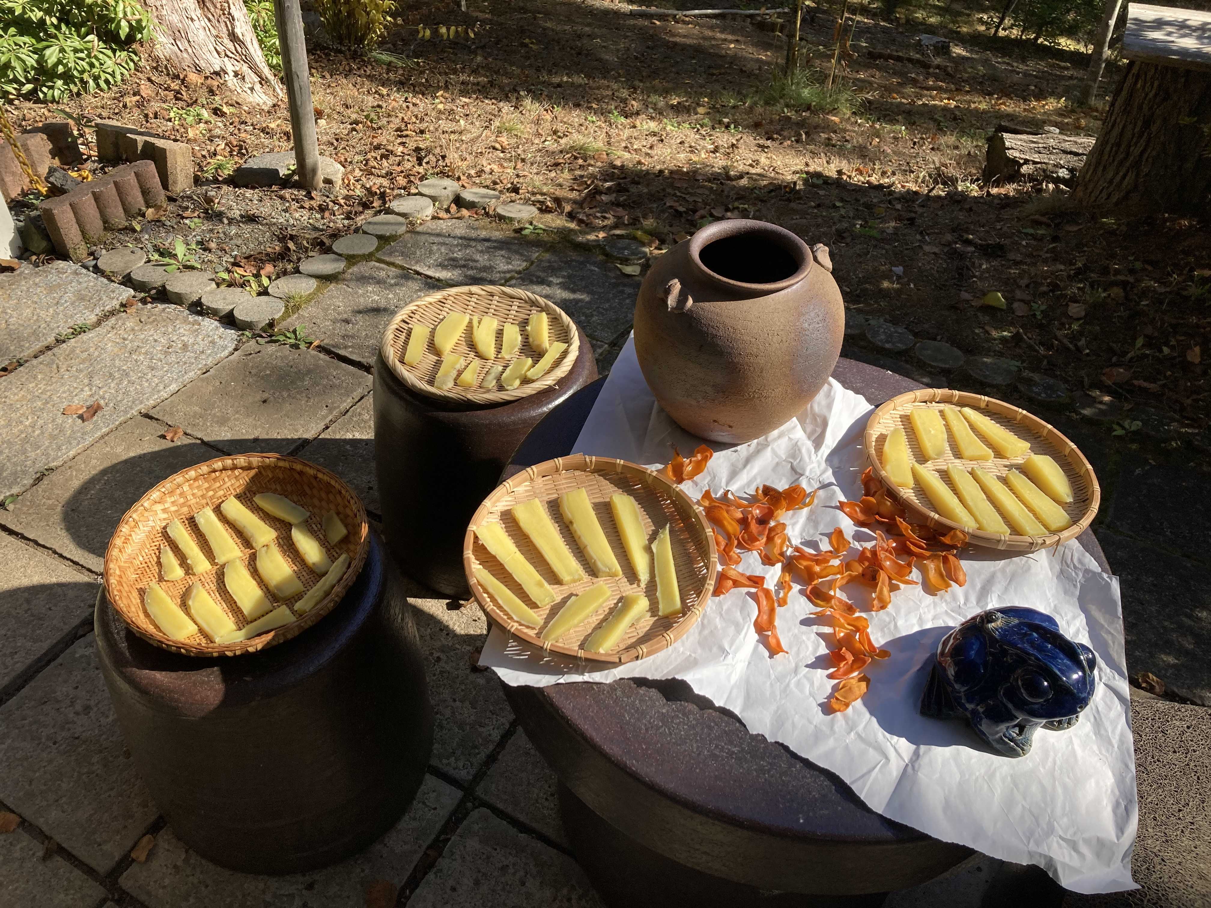 昨日は柿(市田柿)、今日はサツマイモ(紅はるか)を干してみましたー