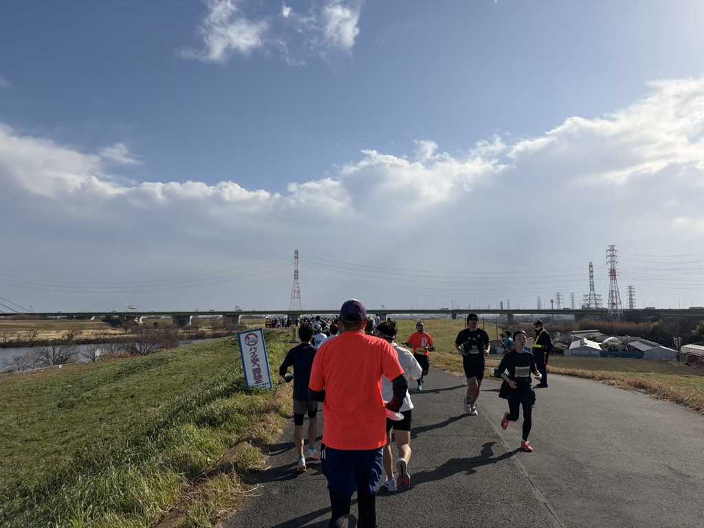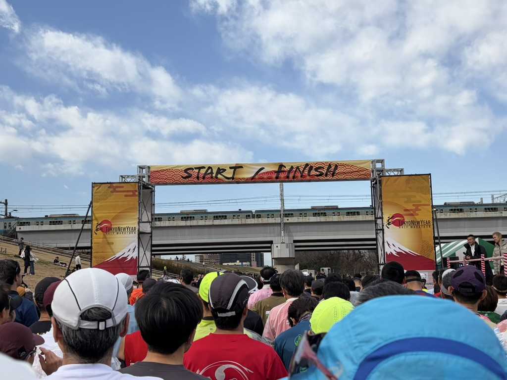 今日は2026年シーズン初戦の、東京ニューイヤーハーフマラソンです。 今年で11回目の参戦となる、もう新年恒例のレースです。 赤羽の荒川河川敷に来ると、また今年も始まったという感覚になります。 今年は例年になく気温が高く、寒さ対策の面では助かります。 会場は曇り空、しかしながらかなり風が強いです。 ランニング仲間とも会えて、スタートに行くタイミングで見送り、自分もスタートラインに着きます。 スタートする前には、青空も覗いてきました。 天気が良くなって、気持ち良く走れると思ったのも束の間、すぐに強い日差しを浴びることになります。 2km過ぎには既に手袋を取り、アームカバーも下げて走ることになりました。 さらに、行きは向かい風も浴びるので、我慢して力を蓄えます。 前半は本当にきっちりとした4分45秒ペースで刻み、9kmからの上りもリズム良く上り、下ると中間点の折り返しです。 折り返してからは再び少し上りますが、ここを快調に走り、勝負の後半に臨みます。 去年はこの後半から気持ち良くペースを上げて、1時間37分台で走ることができました。 今年もそのイメージで走っているのですが、思いのほかペースを上げられません。 見ると、心拍数が170程度まで上がっていました。 フルなら1kmほどペースを大きく落として凌ぐのですが、ハーフは距離がないので、そのまま我慢してキープします。 残りが長いな、と感じていますので、調子が上がっていない時のパターンです。 「目覚めろ!その魂」と喝を入れ、終盤にペースを上げていきます。 ラスト3kmは腕を振って絞り出しました。 苦しい走りになりましたが、手元タイムでは1時間39分8秒で、何とか100分切りはできました。 やはり、年末年始で鈍った身体を目覚めさすには、大変良いレースでした。 結果は不本意ですが、それでも終わってみれば楽しかった、と言えるのがマラソンの良さだと思います。 少し余韻に浸りたいところですが、今日は月次決算の確定日なので、これから帰って在宅勤務します。 また明日、ゆっくり振り返りたいと思います。