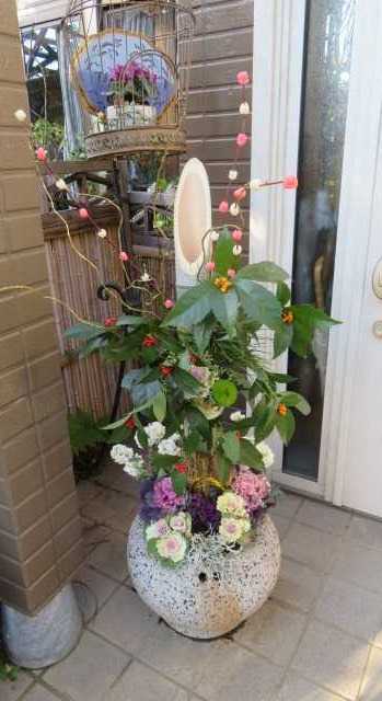 皆さま素晴らしい新年をお迎えのことと思います 我が家は嵐の前の静けさで夫婦2人のんびりと過ごしました しかしながら 明日 一族11人集合でにぎやかな怒涛の一日になります 朝4時には起床してごちそう作りです 頑張りますね ちなみに今日 元旦生まれの私は63回目の誕生日でした(笑) 又、歳を取り嬉しいような悲しいような寂しいような そして今日まで生かされた感謝の日でもあります 昨年は義父(享年96歳)の他界、5人目の孫の誕生と めまぐるしい一年でしたが幸せな一年でもありました そして新しい一年を素敵にそして幸せに迎えるために いろんな正月飾りを手作りしましたので 紹介させてくださいね 毎年頂く青竹や 盆栽鉢を使って自己流に 裏庭のテラスには ![]() 私の亡き父から 手ほどきを受けた松竹梅盆 ![]() 梅と松だけは毎年そのまま育てて使っています ![]() 笹やヤブコウジも昨年の物を ユキノシタ、コケを新しいものに変えます そして最後には白い化粧砂を撒いて完成 近所の方にはいつもほめていただいてますよ ![]() 次は大きなスイレン鉢に 庭の山茶花や 南天の木 梅の木を切っって生け花に(・∀・)ウン!! 今年初ですがいい感じにできましたよ ![]() こちらは毎年作ってる 青竹をくりぬいて鉢にして 葉ボタンをギッチリ上こんな寄せ植え 私のお気に入りでもあります ![]() さぁ それでは 青竹を使った洋風門松です 青竹を 上部を斜めに 中間ほどに花が生けられるように 水をためられるようカットして ![]() しっかりと鉢に青竹宇を固定して 足元には 正月らしい葉ボタンをたっぷり植えこみます コツはできるだけびっしりとね^^ ![]() あとは水を竹に注いで 正月花を生けるだけ🎍 ![]() 簡単ですが とっても素敵な洋風門松🎍の出来上がりです ![]() 玄関に洋風しめ縄と一緒に飾ると 玄関扉にもマッチして 気分が上がりますよね ![]() 青竹を2本いただいたので ガゼボのアプローチに飾りましたよ ![]() こちらは火鉢で 穴が開いてないので 植物を植えこむのでなく 火鉢に砂利を入れお正月を迎えるて青竹を固定して ビニールポットのまま葉ボタンを足元に入れてあります わらで編んだコモを竹に巻き付けてあります 玄関の門松とはまた違い素敵です たくさんの正月飾りを作り 飾ってるとお正月を迎えるという気持ちも整い 毎年のことですが新しい一年が幸せな一年になるような そんな気持ちでいっぱいになります 皆さんはどんな正月飾りで 新年を迎えられていますか? ![]() おまけになりますが 12月29日 姉から株分けしてもらった 『月下美人』が 同時に5輪開花しました(〃艸〃)ムフッ お正月の開花を希望だったんですが フライングでした(笑) ![]() 月下美人は一日だけ夜に咲く花で有名ですよね 清楚で気品あるこのお花は 朝になったら次第にしぼんでしまいましたが その儚さが 又美しさを増しているんですね ![]() *~*~*~*~*~*~*~*~ 今日は全国的にお天気が良く 初日の出も美しかったようですね🌅 朝テレビで こんなに美しい『ダブルダイアモンド富士』が 拝めました 本当に美しいダイヤモンド富士ですね 今年は素晴らしい幸せな日本が訪れそうで ワクワクします ![]() それでは皆様 楽しく幸せな新年をお過ごしくださいませ 覗いてみてね( ´艸`) いろんなお花がありますよ 今日もばぁばの薔薇の花園にお越し下さり 有難うございます 不定期の更新になりますが 又ご訪問くださいね *ごめんなさい!コメント欄を閉じています お気に入りの記事を「いいね!」で応援しよう