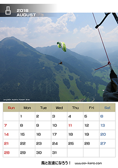今年の8月は何をしようかなぁ・・・?ぴょんちゃんは、ゴールデンウィーク前に夏の予定を確定しちゃうようにしているこの頃です(^^;8月のカレンダーに採用した写真は・・・去年8月、オーストリア Kossenで車イスの方と空をご一緒できたこの一枚にしました。特製車イスで、テイクオフ時にサポートはあったようですが、ご自分の判断でお空を堪能されるその飛びっぷりは、健常者のそれを上回るすばらしい技量でした。足が不自由だから、、、という理由であきらめかけている人の励みになれば幸いです。 【画像版】http://pp-kero.com/para/calendar/2016/aug2016.jpg【PDF版】http://pp-kero.com/para/calendar/2016/aug2016.pdf ---------------今年もお会いできるかな? お会いできるといいなぁ(^^/