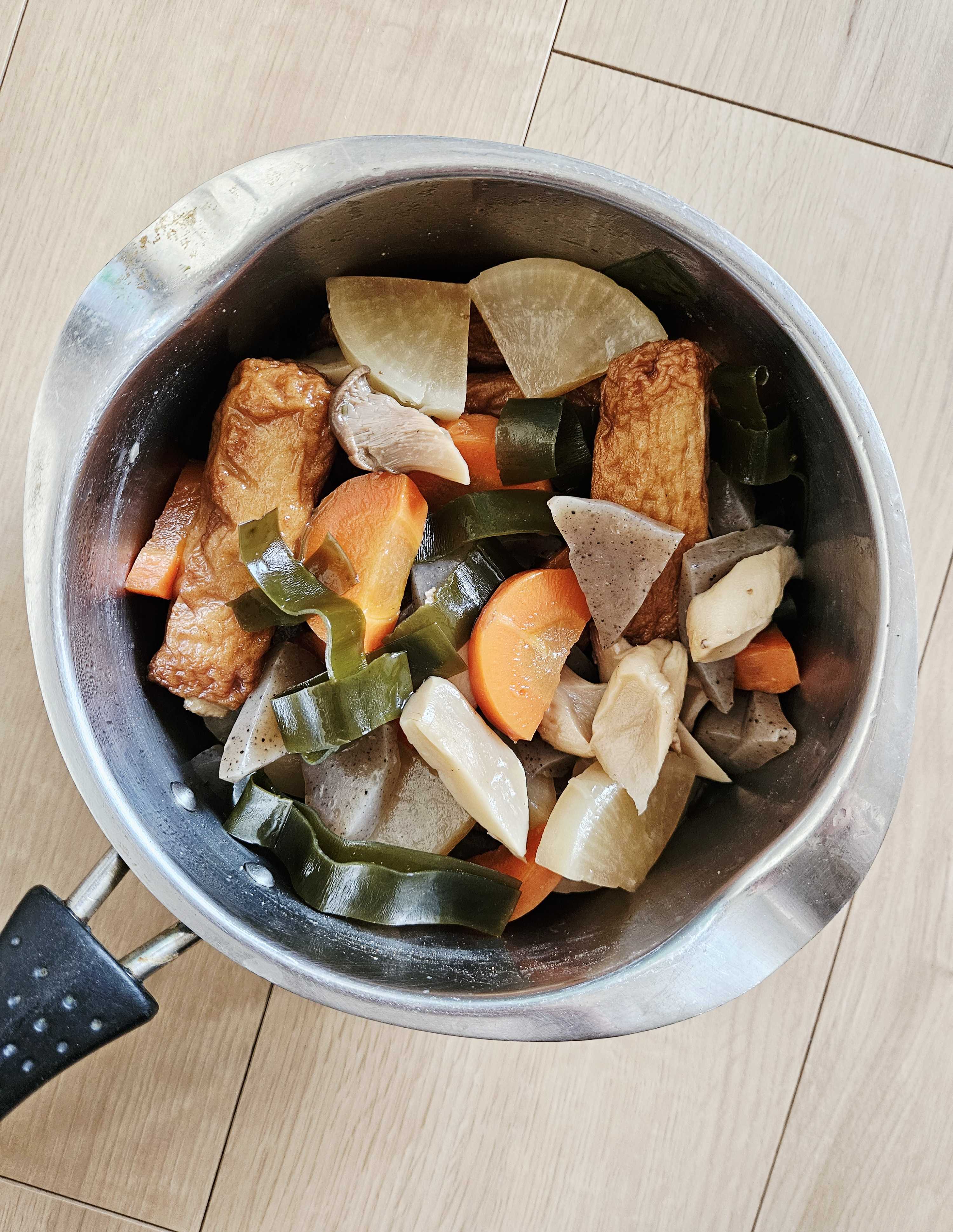 大根、人参、こんにゃく、昆布、エリンギ入り煮物父が作った料理をいただく😊エリンギ肉巻き朝食お味噌汁付きも嬉しい母が倒れてから必然的に父が主夫になる色々工夫して料理を楽しんでくれてます😊