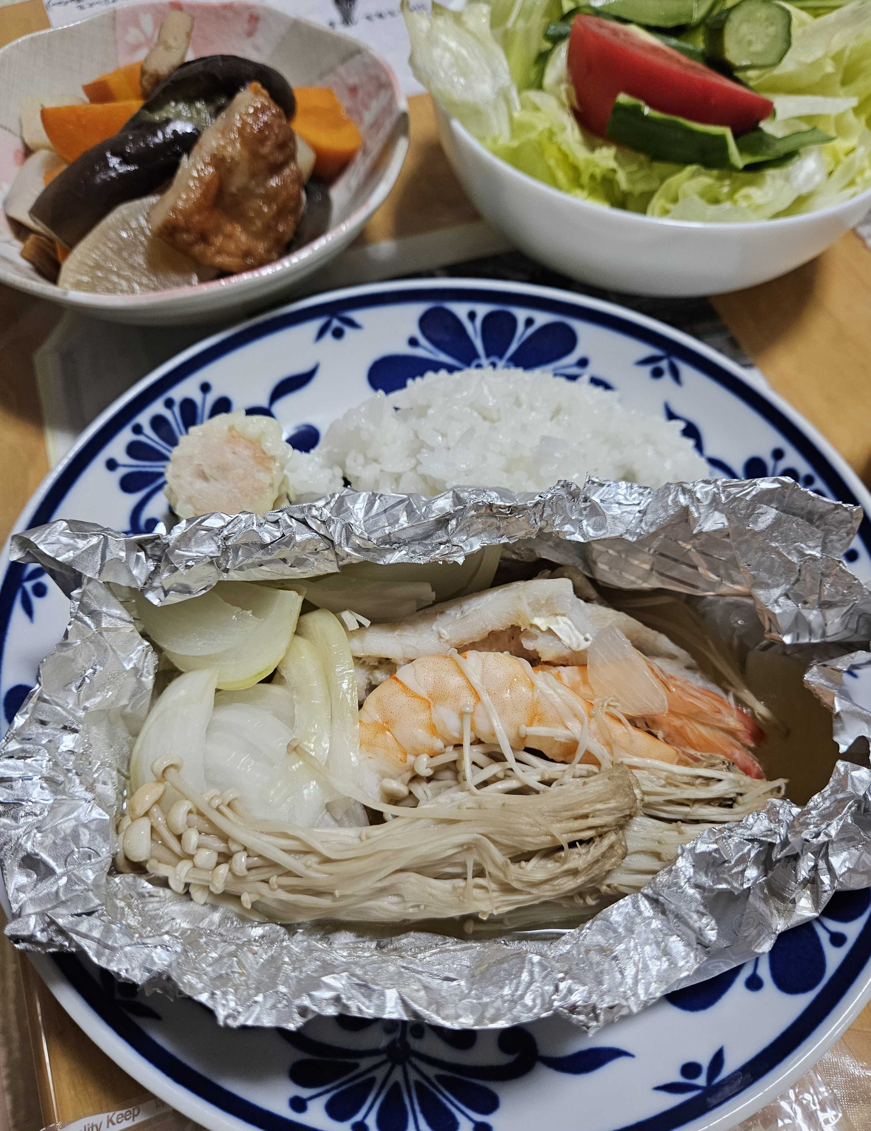 父が作ってくれた朝食 野菜はレンジを使って お味噌付きが嬉しい😊 夕食も父が作ってくれた 海老と鱈のホイル焼き IHも使い慣れて 料理を楽しんでいる父 感謝していただきます 夕方になると太鼓が響く町中 地域のお祭りの練習中でした 立派な鳥居⛩️ 八幡神社の例大祭が行われる 普段は静かな境内 癒される場所 少し涼しくなり 過ごしやすさを感じます 数日前の満月🌕綺麗でした