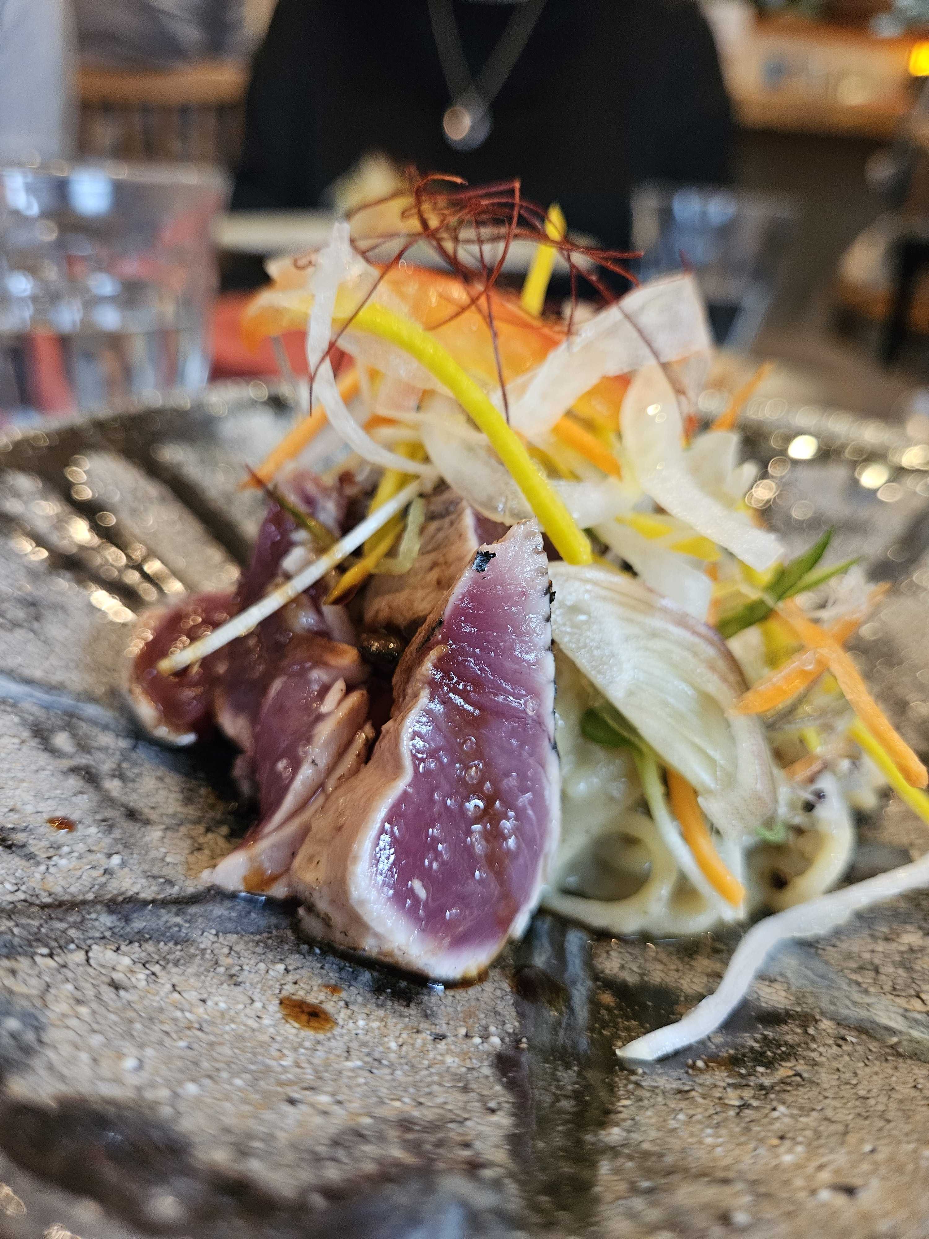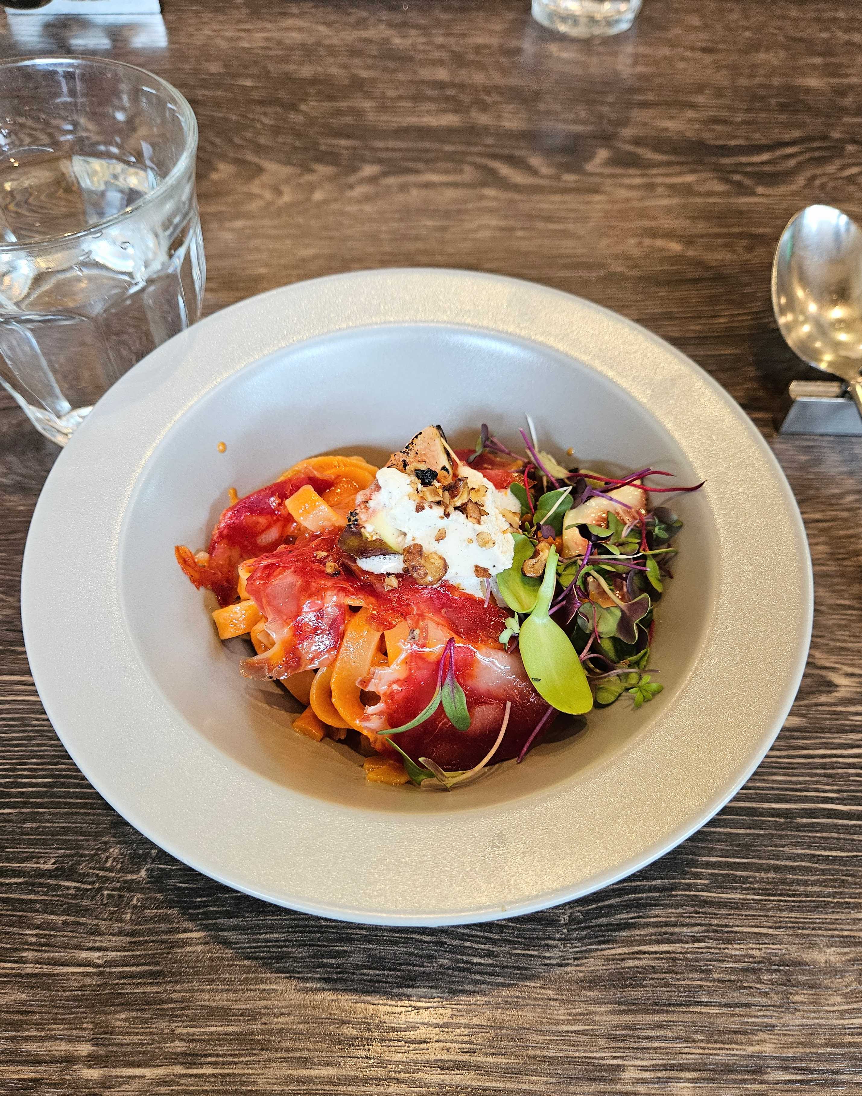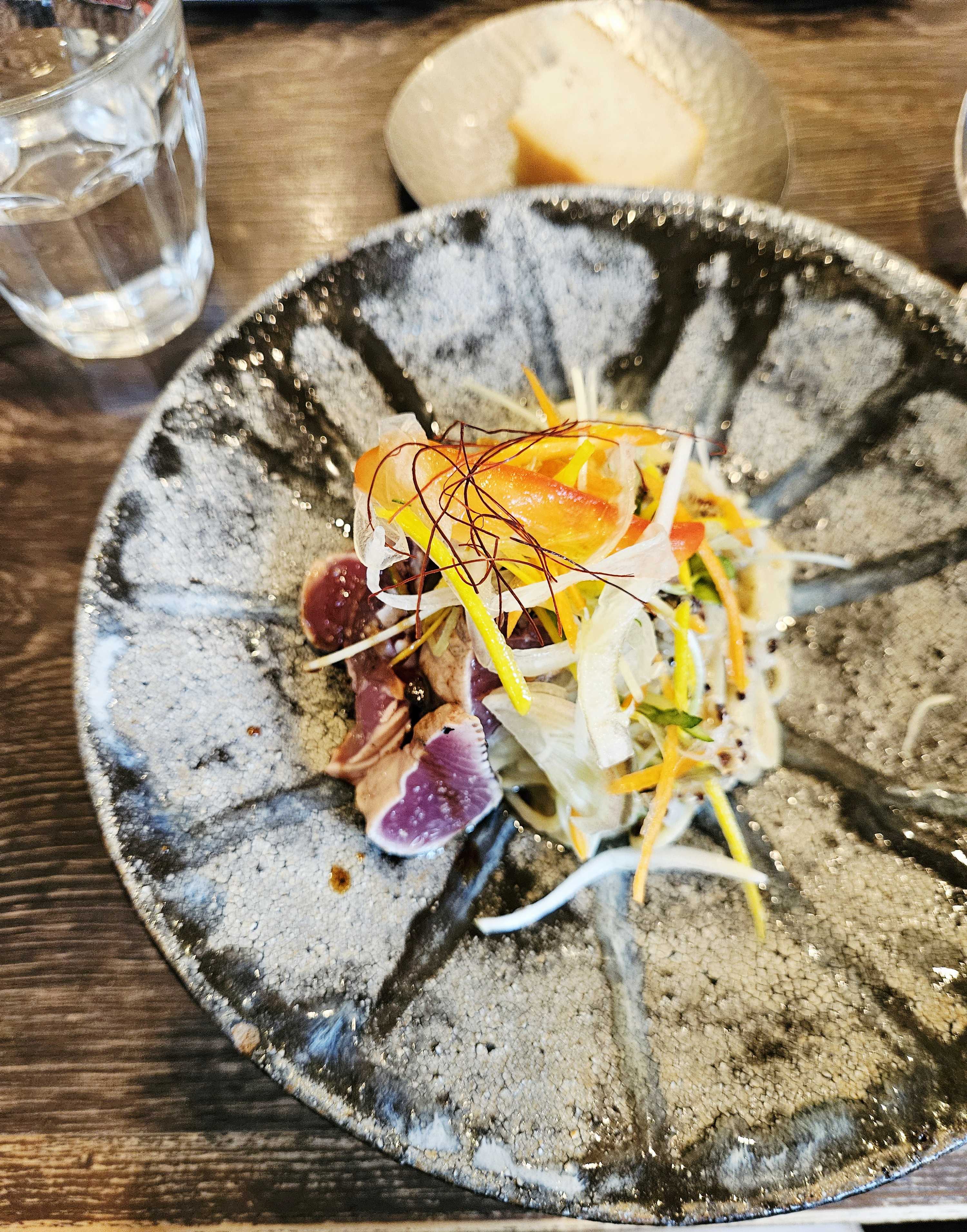 パスタランチ🇮🇹をいただきました! サラダ ハーフパスタの1皿目 焼きいちじくとトマトクリームのタリアテッレ ハーフパスタの2皿目 炙り鰹の冷製スパゲッティーニ フォカッチャはローズマリー入り 食後のデザートと紅茶 焼いた栗の粉と松の実入り しっとり感はなかったけど 甘さ控えめでよかった ワイン🍷飲み物メニュー お店の入り口 ずっと気になっていたお店 友達のおかげで4人でランチ! 楽しい時間でした😊