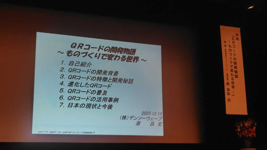 最近は、水曜日だけでなく、土曜日も色々と用事が入って来ています。 この日は、朝9時30分から、多治見市の区長会へ出席。 多治見市は、50の区に分かれ、その下に数か所の町内会が組織されています。大きな講堂に、50人分の机と椅子がロの字に並べられていて、壮観です。あ、多治見市長も、市議会議長も出席されています。 背広を着てきて、よかったです。早めの議題なので、すぐに終わるかと思ったのですが、愛岐道路の落石事故についての説明などもあり、また、おいらたちの議題についても、たくさんのご意見をいただき、会場を後にしたのが11時近くになってしまいました。 そのまま、次の会場に向かいました。 会場は、名古屋市内です。 ![]() 母子寡婦福祉大会です。 午前中の式典には、残念ながら間に合いませんでした。 午後からは、講演会です。これがとても興味深いテーマでした。 ![]() なんと、QRコードの開発物語、開発者のデンソーの原さんの講演です。 1時間半の講演、初めて聞く内容ばかりで、とても面白かったです。 お馴染みのバーコード、1949年にできたときには、どの方向からも読みとれるように、円形だった、と。中心の小さな円から徐々に大きな円をいくつも描いていく図ですが、印刷技術が追い付かず、外側の円がにじんでしまい読み取り不能ばかりだったそうです。 QRコードは、1994年に発明された、と。 最初はデンソーの部品管理などのための伝票用だったそうです。たくさんの情報を記録することができ、7,089桁(億で9桁ですから、どういう単位で呼ぶのかもわからない桁数です。)と想像できない情報量です。 そもそもQRとは何の略称か、も知らないおいらです。 Quick Response のQRだそうです。囲碁をヒントにして、開発が始まった、QRコードは、登録商標としている(他人に登録されるのを防ぐため)とが、利用は無料・無制限。だからこれだけ広まったのでしょうね。 どうしてエンジニアを目指したのか、などの部分については、子どもたちにも聞いてもらいたい内容でした。 これだけの発明をしても、謙虚な姿勢や言葉遣いで講演でした。 講演後に名刺交換をさせていただきましたたが、飾らないお人柄で、おいらよりも2つ年長の方でしたが、このように齢を重ねたいなぁと思いました。 その後、また、すぐに多治見に戻りました。 奥さんから、灯油缶3つの給油指令がでていましたので、家についてすぐに、ガソリンスタンドに向かいました。 30分ほど休憩。 この日の夜は、オヤジ会の忘年会です。 午後5時に集合場所へ。 ![]() スマホでは明るく見えますが、日は暮れています。 緑のマーク、ここは小学校の通学路です。狭いので、ガードレールはつけられません。 オヤジたちも一列に並んで、忘年会会場に向かいました。 ![]() 交流センター前を通過。今春から、児童館と統合して、公民館が交流センターになりました。 お気に入りの記事を「いいね!」で応援しよう