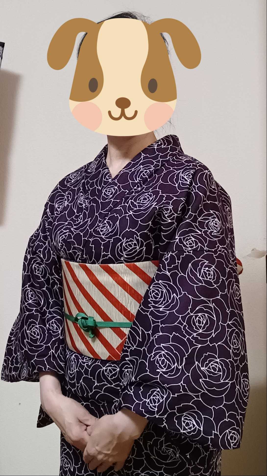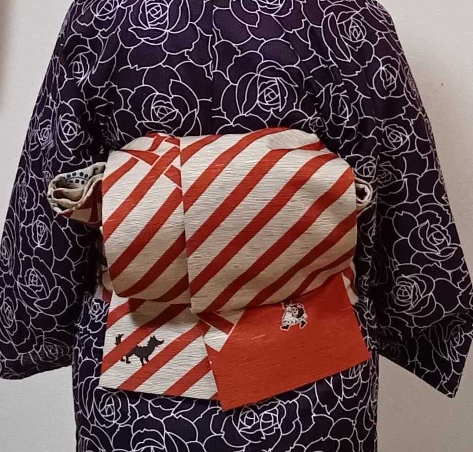記念に旗を頂きました。 ちなみにこの日のコーデは 薔薇柄の浴衣 赤ずきんの半幅帯 狼が赤ずきんを狙ってる風にしたくて角だし太鼓風に結んだら、赤ずきんちゃんが隠れ気味になってしまいました。