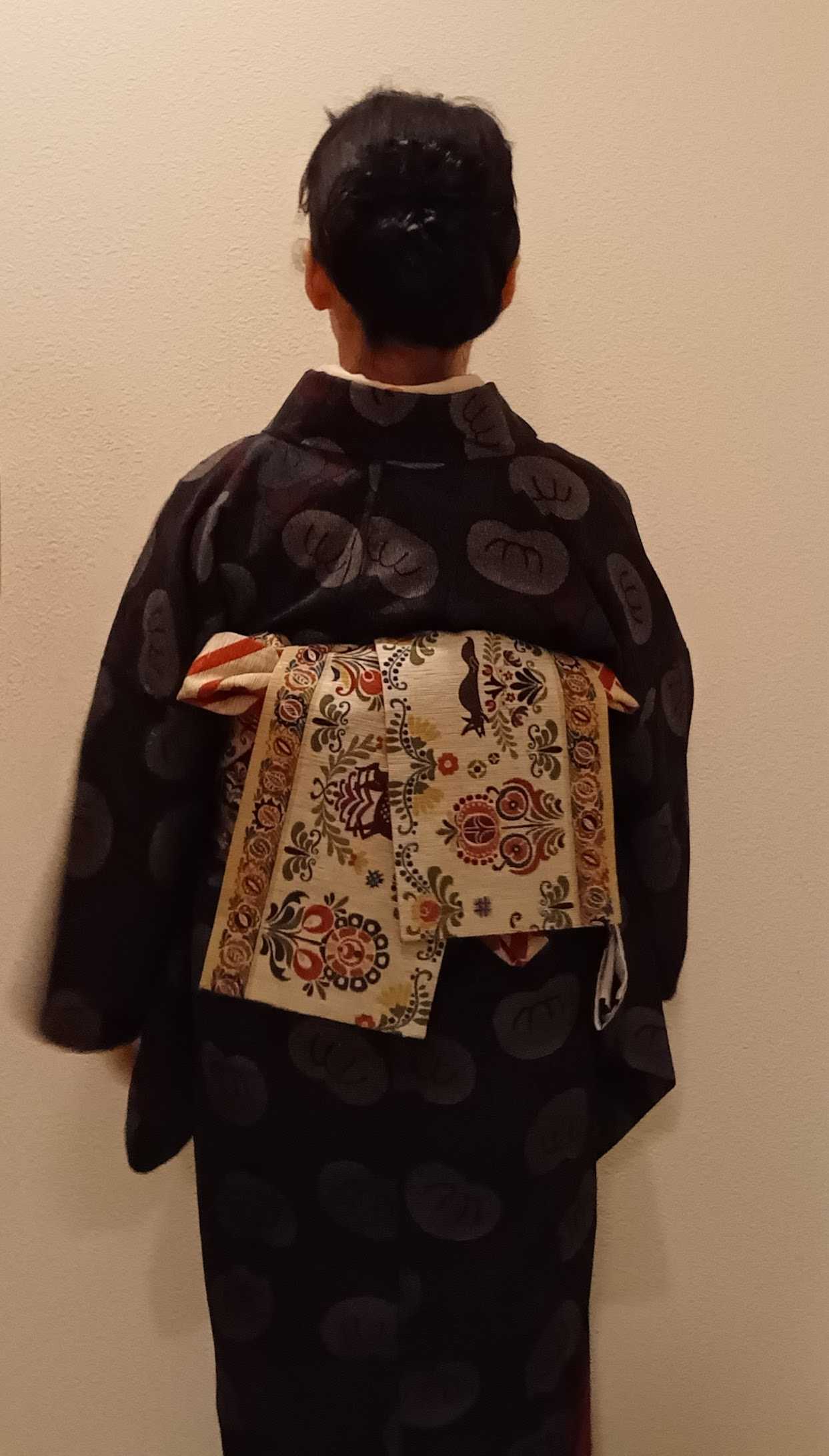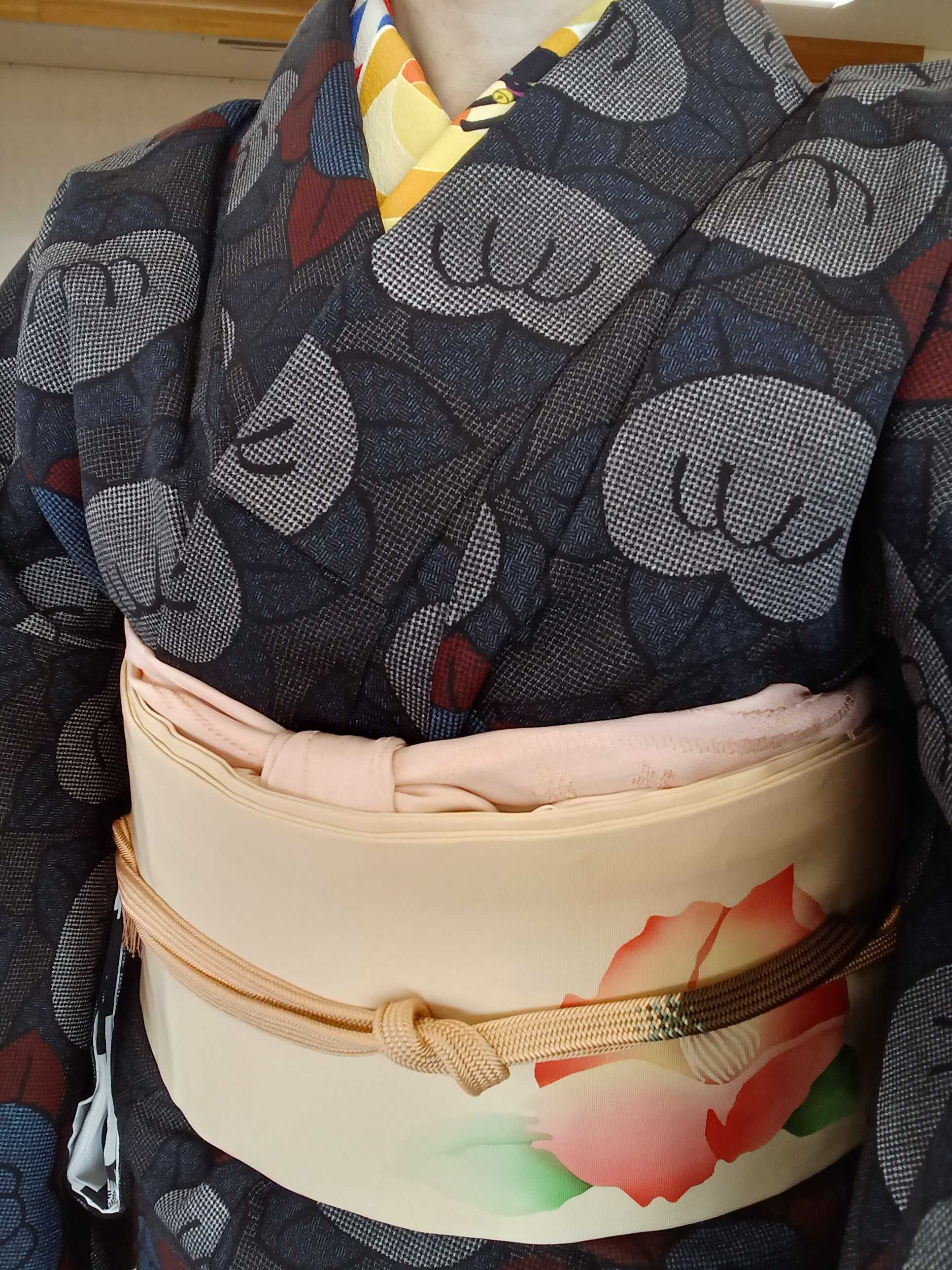 11月始め、11回目の教室は写真撮り忘れたので飛ばして、着付け教室12回目 文化祭も終わって、この日は改良枕で結ぶお太鼓 まずは袋帯で二重太鼓 この竹柄の袋帯は和裁教室で頂いたもので、結びやすくて練習にピッタリな帯 そして名古屋帯のお太鼓 これも頂きもので椿の柄の帯なんですが、お太鼓部分の椿の花が下向きなんです。 あれ?もしかして逆さに描かれてる!? 調べてみたら、椿って下向きに咲く花だったんですね~ 今まで、椿祭りに行ったり何度となく椿を見てきたはずなのに知りませんでした。 この日は、教室の後そのままお茶席に行く予定だったので着替えずに帯だけ半幅帯に変えて行きました。