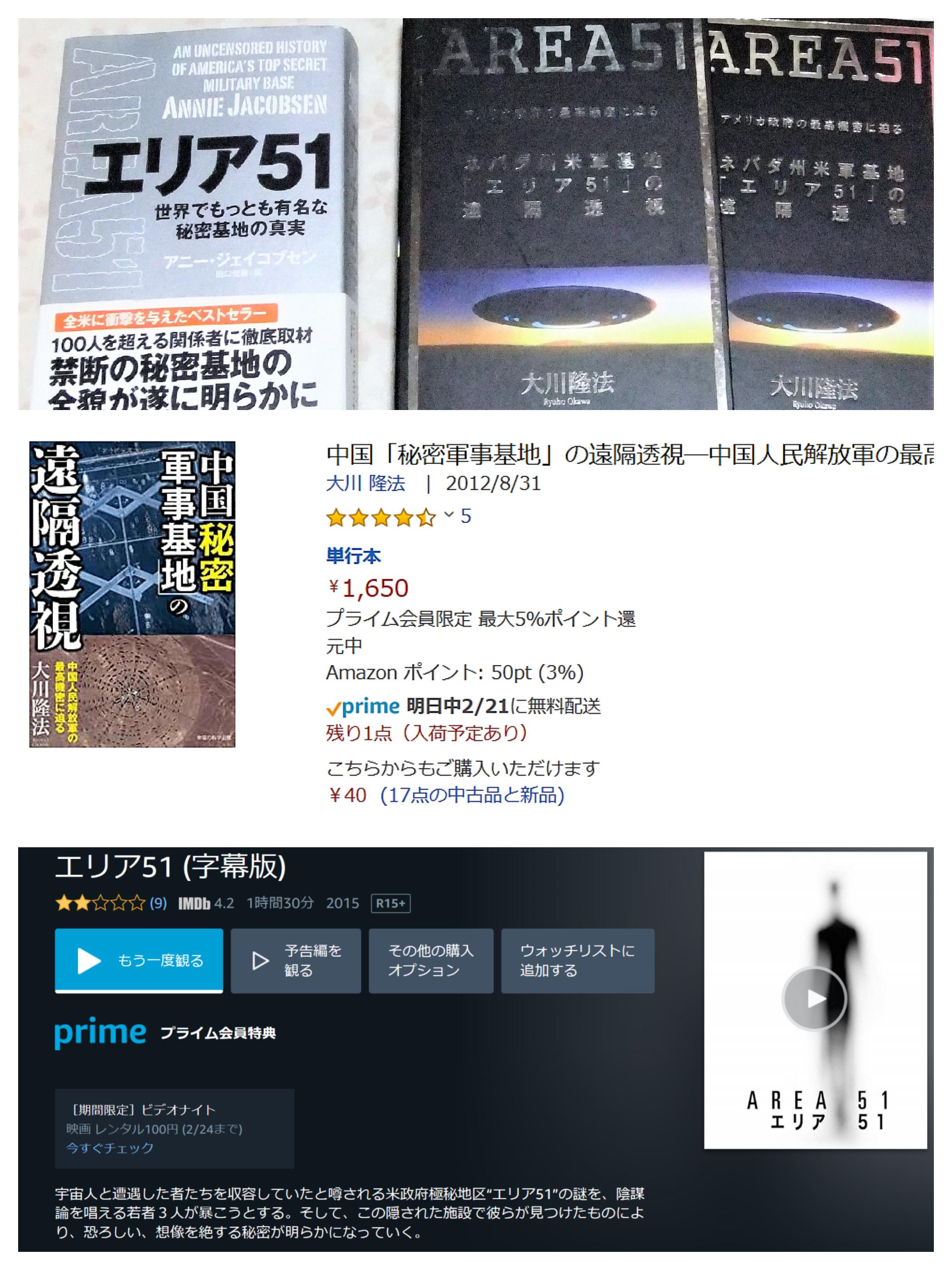 アメリカもそうですが、中国も宇宙人の技術供与を受けていますから、軍事関係はあなどれませんね~。(姿、形を隠せる見えないステルス機もその一つ)日本を応援したい宇宙人もいますが、国がUFO・宇宙人拒否状態なので技術供与できませんね。外から見守るのが精いっぱいのようです。自分の国は自分で守るのは当たり前なんですがね~。今年から動きがあるようですが・・ ★ 2012年4月にアニー・ジェイコブセンの発刊したエリア51(532p)は全米ベストセラーになりましたが、内容がないよう(笑)、でがっかりでしたね。UFOも出てこなければ、宇宙人も出てきませんでしたね。【書籍】エリア51 世界でもっとも有名な秘密基地の真実 (ヒストリカル・スタディーズ) アニー・ジェイコブセン、 田口俊樹2012/4/5単行本¥2,640https://www.amazon.co.jp/dp/4778313011/ref=cm_sw_r_tw_dp_U_x_gVuBEb07GM4EV ☆2012年6月に大川総裁の発刊したエリア51(219p)は、UFO情報、宇宙人情報、水棲生物情報、兵器工場情報、などのほかにも、フロリダUFO・宇宙人墜落情報、ベトナムUFO・宇宙人情報など驚愕の真実がてんこ盛り!米軍に暗殺されかねない内容ですね!【書籍】ネバダ州米軍基地「エリア51」の遠隔透視 (日本語) 単行本 – 2012/5/31 大川 隆法 (著) 単行本 ¥11,000https://www.amazon.co.jp/dp/4863951957/ref=cm_sw_r_tw_dp_U_x_qUuBEbN6K1B04 ちなみに、映画のエリア51は、最初ドキュメンタリータッチで面白いですが、肝心のエリア51内に侵入してからが、かなりボケてきてまして、はっきりしませんでしたね~。【映画】エリア51(2015年製作) 他の参考書籍【書籍】中国「秘密軍事基地」の遠隔透視―中国人民解放軍の最高機密に迫る・大川隆法(著)2012/8/31 単行本 ¥1,650 https://www.amazon.co.jp/dp/486395221X/ref=cm_sw_r_tw_dp_U_x_ULuBEb26NEF3B