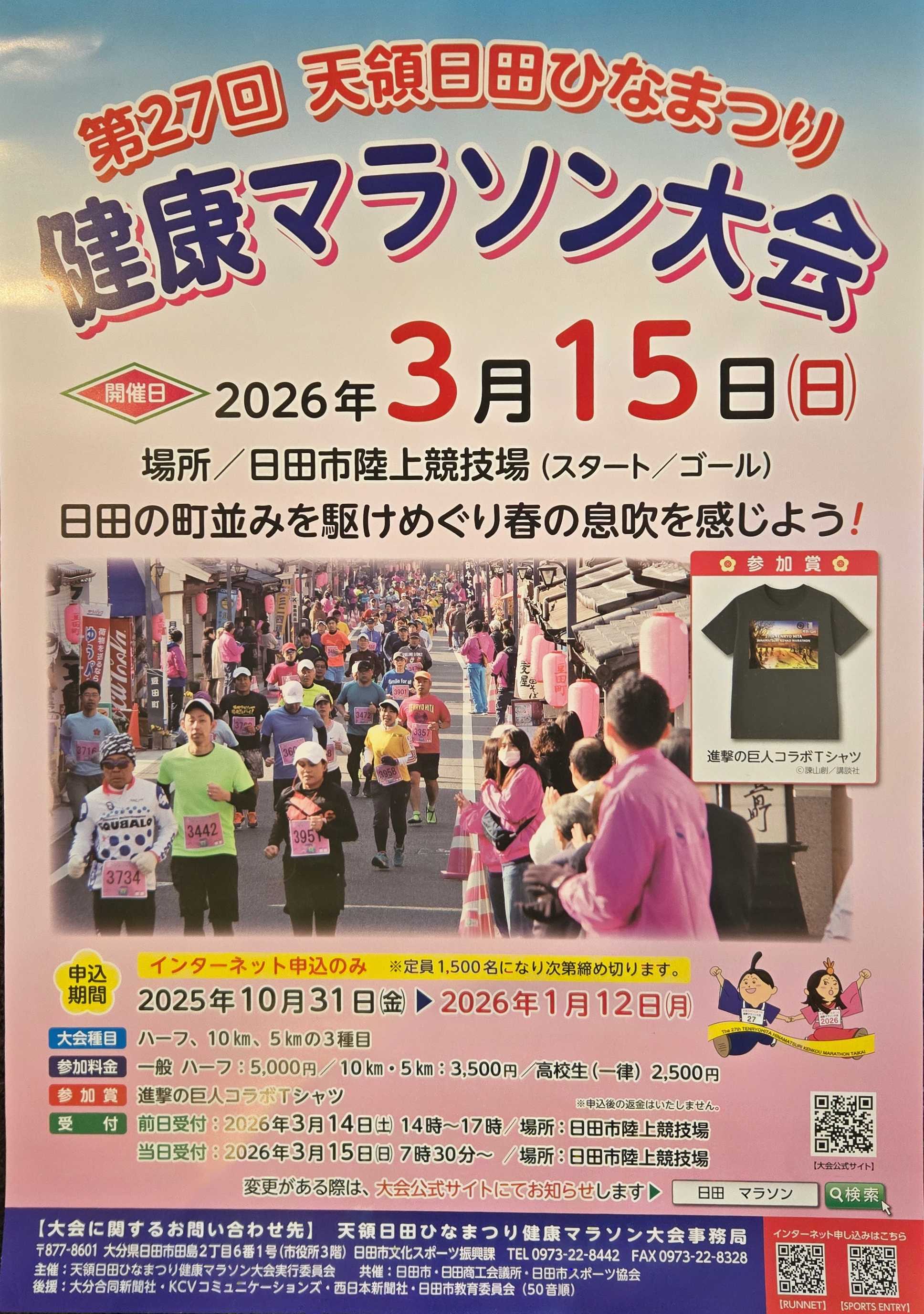 歴史ある町並みと春の訪れを感じる特別なマラソン大会2026年3月15日(日)、大分県日田市で「第27回天領日田ひなまつり健康マラソン大会」が開催されます。天領として栄えた日田の美しい町並みを駆けめぐりながら、春の息吹を全身で感じることができる素晴らしいイベントです。大会概要開催日時2026年3月15日(日曜日)会場日田市陸上競技場(スタート・ゴール地点)定員1,500名(定員になり次第締め切り)参加種目と料金大会では、それぞれの体力やレベルに合わせて3つの種目から選ぶことができます。ハーフマラソン: 5,000円(一般)10km: 3,500円(一般)5km: 3,500円(一般)高校生: 2,500円(全種目一律)特別な参加賞今回の参加賞は、日田市ゆかりの人気アニメ「進撃の巨人」とのコラボレーションTシャツです!大会の思い出とともに、特別なTシャツを手に入れることができます。申込方法と期間申込方法: インターネット申込のみ申込期間: 2025年10月31日(金)〜2026年1月12日(月)定員1,500名になり次第締め切りとなりますので、参加をご希望の方はお早めにお申し込みください。受付について前日受付日時: 2026年3月14日(土) 14:00〜17:00場所: 日田市陸上競技場当日受付日時: 2026年3月15日(日) 7:30〜場所: 日田市陸上競技場日田の魅力日田市は、江戸時代に天領として栄えた歴史ある町です。ひなまつりの時期には、古い町並みに雛人形が飾られ、伝統と文化が色濃く残る風情ある景観を楽しむことができます。マラソンと合わせて、日田の観光も満喫してみてはいかがでしょうか。お問い合わせ先天領日田ひなまつり健康マラソン大会事務局〒877-8601大分県日田市田島2丁目6番1号(日田市役所3階)日田市文化スポーツ振興課TEL: 0973-22-8442FAX: 0973-22-8328詳細は大会公式サイトをご確認ください。「日田 マラソン」で検索!主催: 天領日田ひなまつり健康マラソン大会実行委員会共催: 日田市・日田商工会議所・日田市スポーツ協会後援: 大分合同新聞社・KCVコミュニケーションズ・西日本新聞社・日田市教育委員会春の陽気の中、日田の歴史ある町並みを駆け抜ける特別な一日を、ぜひ体験してください!#天領日田ひなまつり健康マラソン #日田マラソン #日田市 #大分マラソン #ひなまつりマラソン #天領日田 #春のマラソン大会 #ハーフマラソン #進撃の巨人コラボ #九州マラソン #大分県 #日田観光 #マラソン大会2026 #ランニングイベント #日田市陸上競技場#HitaMarathon #HinamatsuriMarathon #OitaMarathon #JapanMarathon #SpringMarathon #HalfMarathon #RunningJapan #MarathonEvent #AttackOnTitanCollab #HitaCity #KyushuRunning #JapaneseMarathon #Marathon2026 #RunJapan #HistoricHita