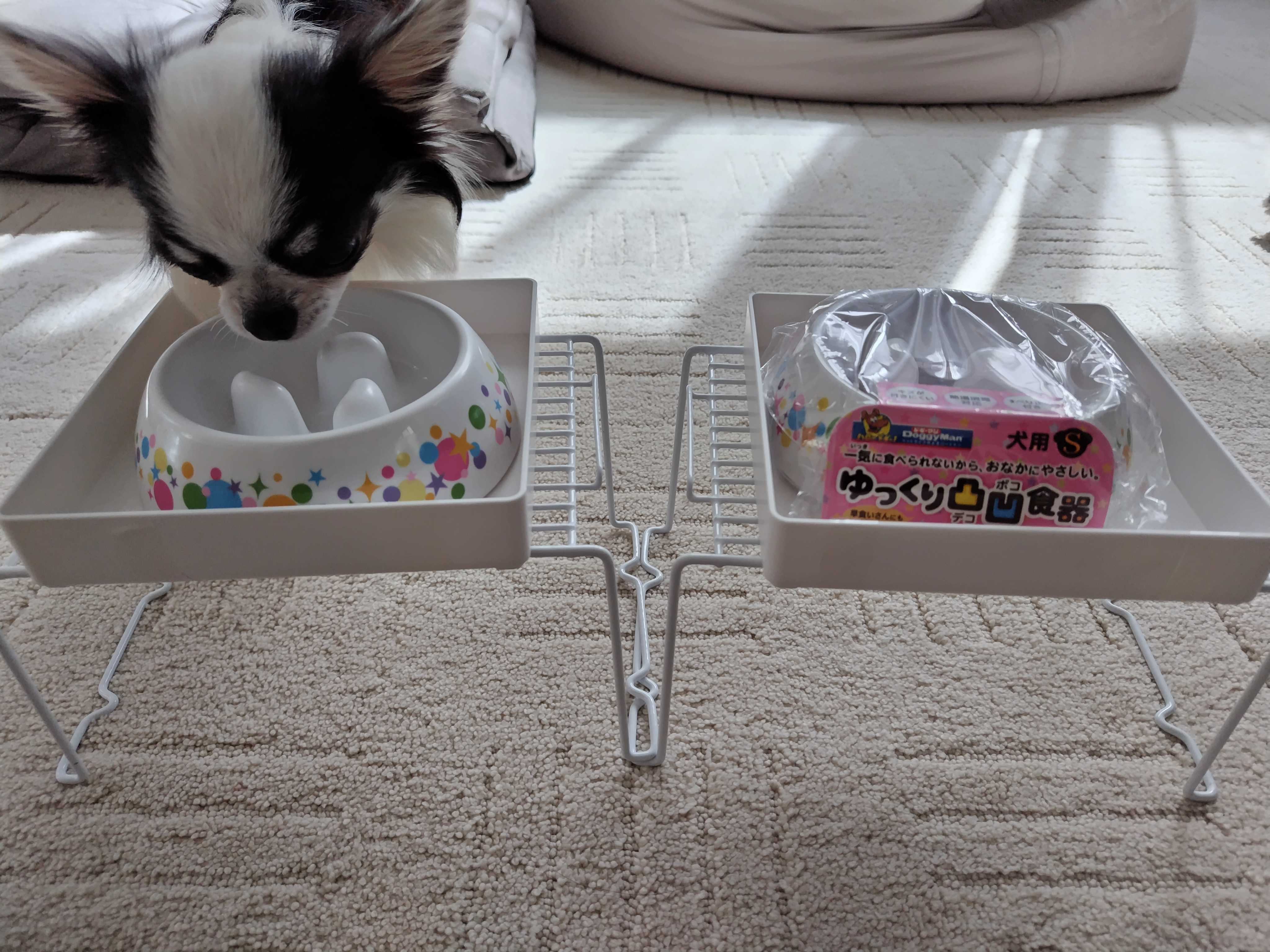 もともときなこの食欲はかなり旺盛! そしてあずきも、かなり旺盛! きなこは早食い防止のお皿で食べさせているのですが あずきは普通のお皿で食べていて 全然噛んでなくて、丸呑み💦 あっという間に食べ終わってしまう💦 ということで、同じお皿購入🌟 ゆっくりデコボコ食器 S【犬 早食い 食器 ゆっくり ドギーマン】 ![]() 床置きだと食べづらそうなので、100均で使えそうなの購入! ![]() とっても良い感じ!!