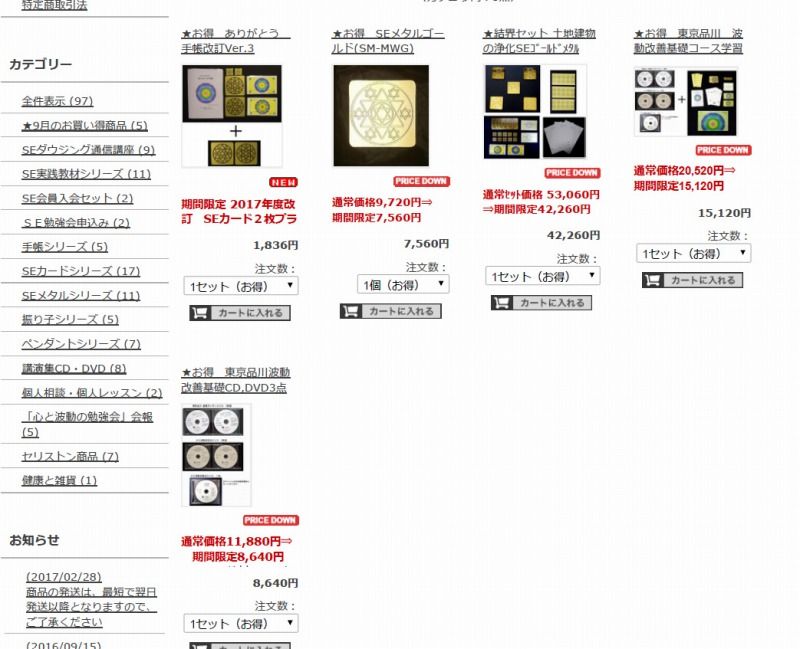 9月いっぱい期間限定で、波動商品を皆様に少しでもお求めやすい金額で販売しております。9月お買い得商品ご紹介ページ★お得 ありがとう 手帳改訂Ver.3価格改正のお願いありがとう手帳は人気の波動アイテムのため、価格を据え置いて販売してまいりましたが、2017年版手帳は最新のノウハウに基づきセット内容の見直しとともに、価格の改正もさせて頂きました。http://selaboshop.cart.fc2.com/ca51/344/p-r51-s/★お得 SEメタルゴールド(SM-MWG)純金メッキ6㎝四角 厚さ3㎜ 重94g重量もあり高級感と荘厳感があり、高パワーのエネルギーです。(厚み2ミリ、大きさ6センチ四角、重さ94グラム)http://selaboshop.cart.fc2.com/ca51/346/p-r51-s/★結界セット 土地建物の浄化SEゴールドメタルセットSEゴールドメタル結界セットは土地建物の浄化用として最適カードセット付きさらに初回限定 波動測定1時間分無料http://selaboshop.cart.fc2.com/ca51/320/p-r51-s/★お得 東京品川 波動改善基礎コース学習セットSE研究所では東京品川会場において、初めての方を対象に、年に数回SE波動改善法の基礎コースを開催しております。ワンデーコースとして、3つのコースを1セットとして勉強会を行っております。DVD,CDの講義の他に付属セットが含まれます。http://selaboshop.cart.fc2.com/ca51/339/p-r51-s/★お得 東京品川波動改善基礎CD,DVD3点DVD,CD教材のみのセットですhttp://selaboshop.cart.fc2.com/ca51/347/p-r51-s/===============================ご覧ください。【心と波動の世界を追究するSE研究所】https://plaza.rakuten.co.jp/kmtnagano/diary/201609070000/【波動エネルギー驚異の気の世界】http://www.selabo.jp/index.html【心と波動の世界・総合版】http://sefuti.seesaa.net/【SE研究所】http://minnanohiroba.jp/selabo