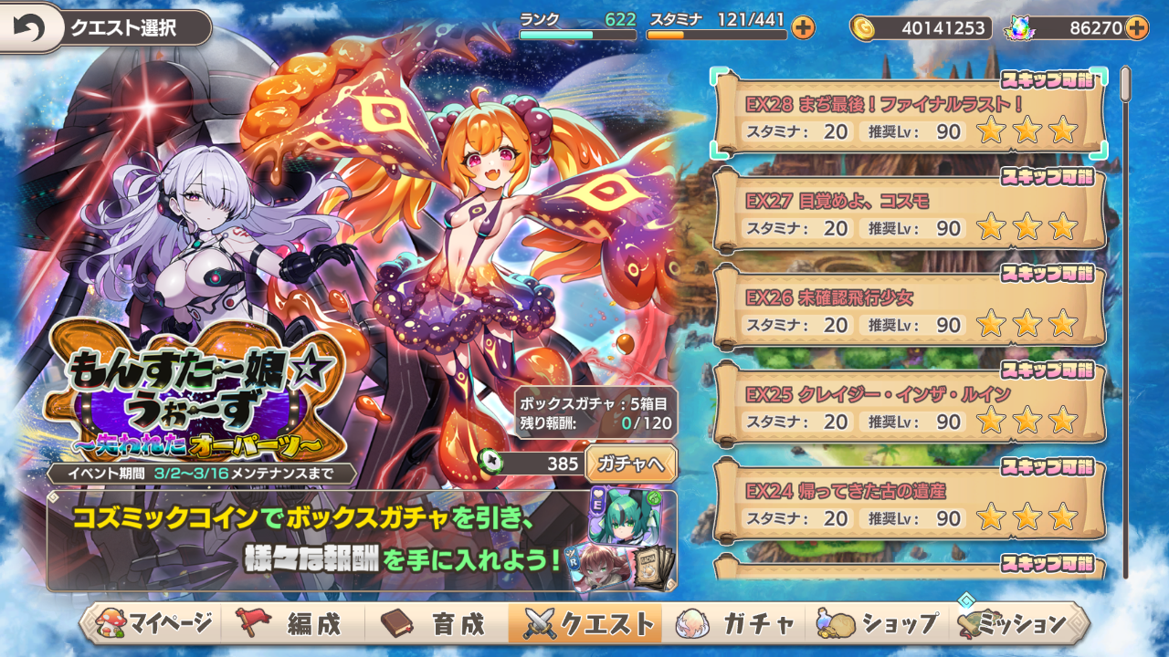 モン娘TDの更新 ![]() 異星人イベントの後半のみ、以上 シンプルだなぁ 後半クエストが追加された もんすたー娘☆うぉーず~失われたオーパーツ~ ![]() ノーマル3、EX2の5つのクエスト 自力クリア出来ました! EX、キツかった~ どっちも難しかったんですけど EX28の方、飛行ゴーレムがいやらしいんですよ 画面の下の方を飛んでゴールに向かって来るから攻撃が届かない 飛行ゴーレムは魔法攻撃を90%OFFするバフ持ちだから 物理攻撃じゃなきゃダメなんです そこで使ったのがアサシン エッシェル、マコモ、コウタの3人を採用しました コウタはスキル発動までに時間が掛かるので つなぎに拳のアイレンも使います 飛行ゴーレムは6体飛んでくるので 最初の3体をエッシェルとマコモで片付けて 残りの3体はアイレンでまとめて仕留めます コウタがスキルを発動すれば、アイレン無しでもイケると思う 画面が広くて、ちゃんと確認出来てません その他の敵は、エフトラとワエマワの広範囲攻撃に 盾を使い敵を足止めをしてアイレンを落とす戦法でイケました クリアするのに何回もリトライして疲れた ここを低レア攻略出来るなら、もう尊敬しますね イベントストーリーは 前回、登場した謎の女の子 後半1話であっさりと顔見せしました ![]() こんなこと言ってますけど幽霊じゃないです 名前はユフォラ この「遺跡に擬態してる基地」略してイセキチ内を 彷徨っているんだそうです ご主人君たちにお願いがあるらしく それは、この基地の最奥まで来て欲しいとの事 なんだか罠っぽくて警戒しますが、宇宙の秘宝の反応も その最奥から感じるというので進みます 敵を倒しながら、基地をどんどん進み ついに最奥に到着 そこには謎の箱がって、そこから秘宝の反応があります さっそく開けようとしますが、ユフォラが別の方を指さします そこにあったのは謎の宇宙船 ユフォラは、これが自分だと言うのです ![]() 彼女は、UFO娘という分類で この宇宙船のシステムであり、ホログラムとして このような女の子の姿で現れているんだとか なんでもワープに失敗して、この基地に来てしまい 故障して動けなくなってしまったとか 基地内を彷徨い、修理をしてくれる人を探してた所 ご主人君たちを見つけたという理由です 箱を開ける前に自分を直せと頼み込まれ 宇宙の秘宝を目前にせっせと作業をするのでした 次回に続く こんな感じですね ようやく物語の根幹的な部分 宇宙の秘宝らしきものに辿り着いたのに 次回ですか 焦らしますね~ その時には、ユフォラがガチャに来るんでしょうね 可愛いのでちょっと欲しいです ガチャと言えば、異星人ガチャチケが まだ引かずに取ってあるので、良い結果が出たら 記事にしましょうかね 何もなければ、そういう結果だったと言う事で 桜パウダー 5g× 2袋 さくら 桜 桜もち 桜餅 桃の節句 ひな祭り 春 葉 パウダー 手作り 和菓子 パイオニア企画 製菓材料 季節限定商品 ' 【 メール便可 】 お気に入りの記事を「いいね!」で応援しよう