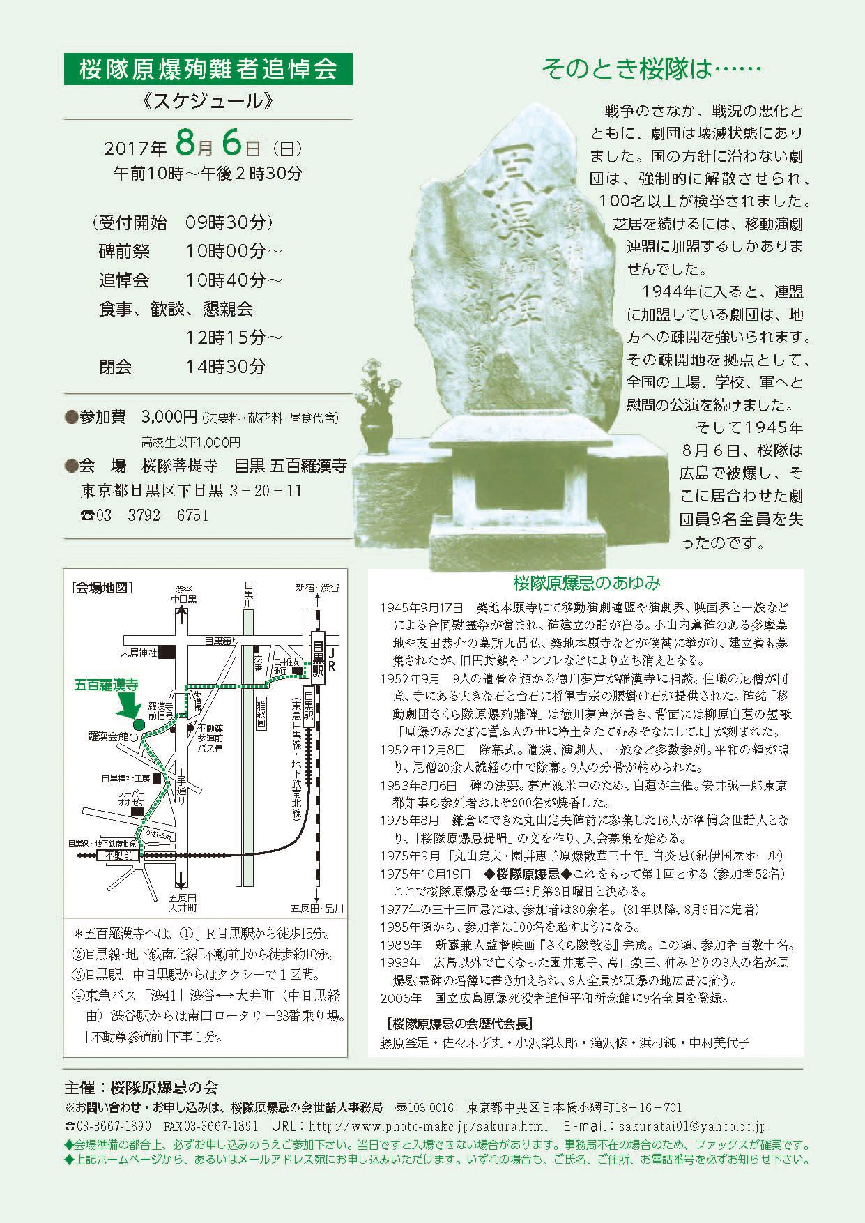 移動演劇桜隊原爆忌の会から 本年の追悼会休止のお知らせ すでにマスコミで報道されましたように、本年1月、当会会長の神山寛が逝去されました。前会長の中村美代子の後を継ぎ、2012年から6年間会長を務めていただきました。ここで改めて哀悼の意を表したいと思います。 さて、私どもは数年来、原爆忌の会の今後の在り方について、桜隊の悲劇を永く後世に残すために永続性のある組織を確立する必要があることを提起し、訴え続けて参りました。その長期展望を実現するための過渡的な運営縮小も検討中であることも昨年お伝えしました。そうした議論の上で、本年の「桜隊原爆殉難者追悼会」を、誠に無念な思いで休止の決断をし、五百羅漢寺様主催の「平和祈念桜隊殉難法要」に参加する形で追悼を捧げてゆくことといたしました。毎年ご参加頂いている方々には深くお詫び申し上げます。 五百羅漢寺様の法要は、8月6日(月)午前8時より「さくら隊原爆殉難碑」前で開催されます。私ども事務局は、ご都合の付く皆様とも、ぜひごいっしょにお参りできればと願っております。 今後、桜隊原爆忌の新たな出発を目指してその環境が整うまでの間は、皆様からお預かりしているご篤志を羅漢寺様への法要料としてお納めし、皆様からの追悼とさせていただく所存でございます。 なお、今後も会の後継、移管先を模索してまいりますが、現在のところ展望は開けておりません。本会の果たしてきた役割を断絶させることなく後世に伝えるためとご理解いただきたく存じ、皆様のご助言、ご助力をお願い申し上げる次第です。 2018年7月7日 桜隊原爆忌の会 世話人事務局 五百羅漢寺様主催平和祈念桜隊殉難法要 8月6日(月)午前8時より さくら隊原爆殉難碑前にて ●五百羅漢寺様 東京都目黒区下目黒3-20-11 ☎ 03-3792-6751 ![]() *五百羅漢寺へのアクセス ①JR目黒駅から徒歩15分。 ②目黒線・地下鉄南北線「不動前」から徒歩約10分。 ③目黒駅、中目黒駅からはタクシーで1区間。 ④東急バス「渋41」渋谷←→大井町(中目黒経由) 渋谷駅からは南口ロータリー33番乗り場。「不動尊参道前」下車1分。 【お願い】当日は羅漢寺様より法要後の休憩場所をご準備いただいておりますので、ご参列いただけるご遺族様ならびにお出かけいただける方は左記までお声かけくだされば幸いです。090-4386-5193(事務局長山崎勢津子宛) 【補記】 「2017年桜隊原爆殉難者追悼会・報告集」につきましては、現在まだこのホームページにはアップできておりませんが、冊子として完成しておりますので、下記から閲覧およびダウンロードができます。 「2017年桜隊原爆殉難者追悼会・報告集」(PDF) (Windows OneDrive) 休会の経緯に関しては、当PDFの21ページに補足させていただいておりますので、詳しくは、お読みいただいたうえでご理解いただければ幸いです。 ◆お問い合わせ等につきましては、下記までご連絡ください。 桜隊原爆忌の会事務局 E-mail:sakuratai01@yahoo.co.jp